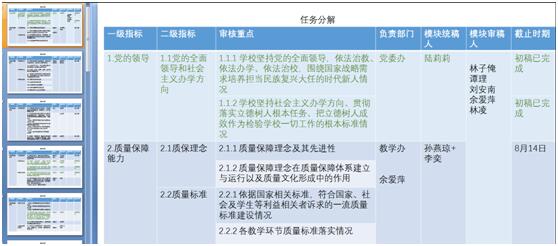 组建审核评估学院、专业自评写作专班,写作专班成员由学院教学院长、教学系(实验中心)主任、院党委办、行政办、学工办、教学办等科室相关人员以及部分老师组成。学院教学院长组织动员部署,按审核评估指标体系做好分工,责任到人,多次集中研讨我校申报参评的《普通高等学校本科教育教学审核评估指标体系(第一类)》的4个一级指标、13个二级指标、37个审核重点的基本要求和精神内涵,认真研读理解陈国龙书记的“新一轮本科教育教学审核评估:政策分析与工作流程” PPT报告,进一步明确审核评估的基本要求、指标体系和审核重点,理解方案的精神内涵,对标对表审核评估指标要求,开展自我评估、自我检验、自我改进,完成学院、专业自评报告及支撑材料的准备工作。