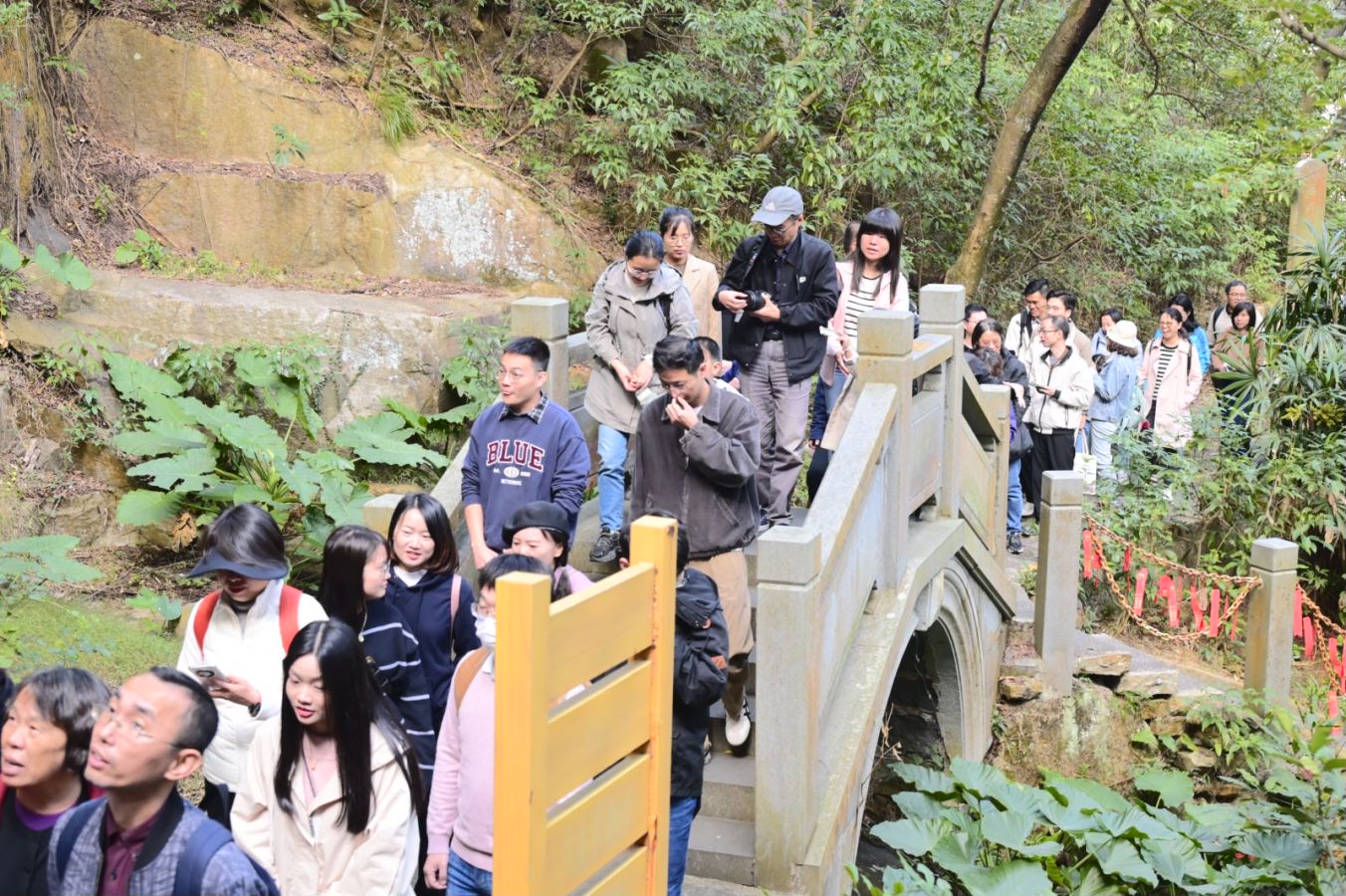 登高远望,赏秋听风。览猴屿洞天岩奇特岩石,穿多样山洞,“状元洞”、“仙人洞”、“蝙蝠洞”,迂回曲折,步步景生。千洞以后,寻光而出,别有洞天,让人不禁感叹大自然的鬼斧神工,一路风光无限,老师们其乐融融。