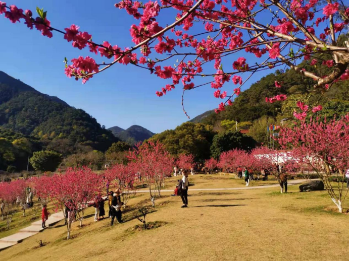 到了春天,缤纷落樱洒落在溪流两岸,粉、红、白三色樱花与潺潺溪水相互应和,水潭幽深碧绿,花影随风摇曳,红粉交织的樱花挂在枝桠。这里种植有226多种的竹类,幽静肃然的竹林伴着鸟儿的清鸣,会带给你竹叶拂心的清幽之感。