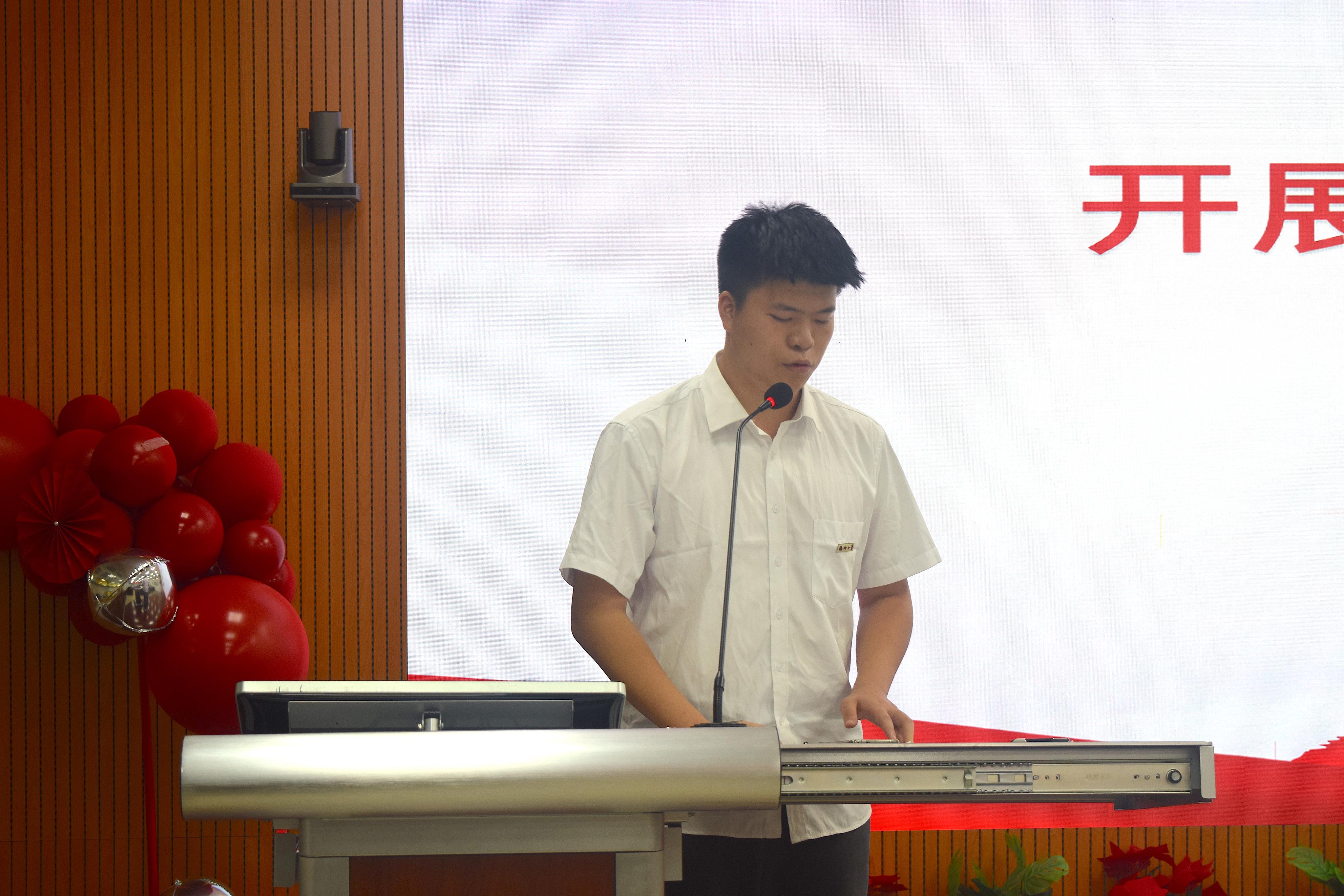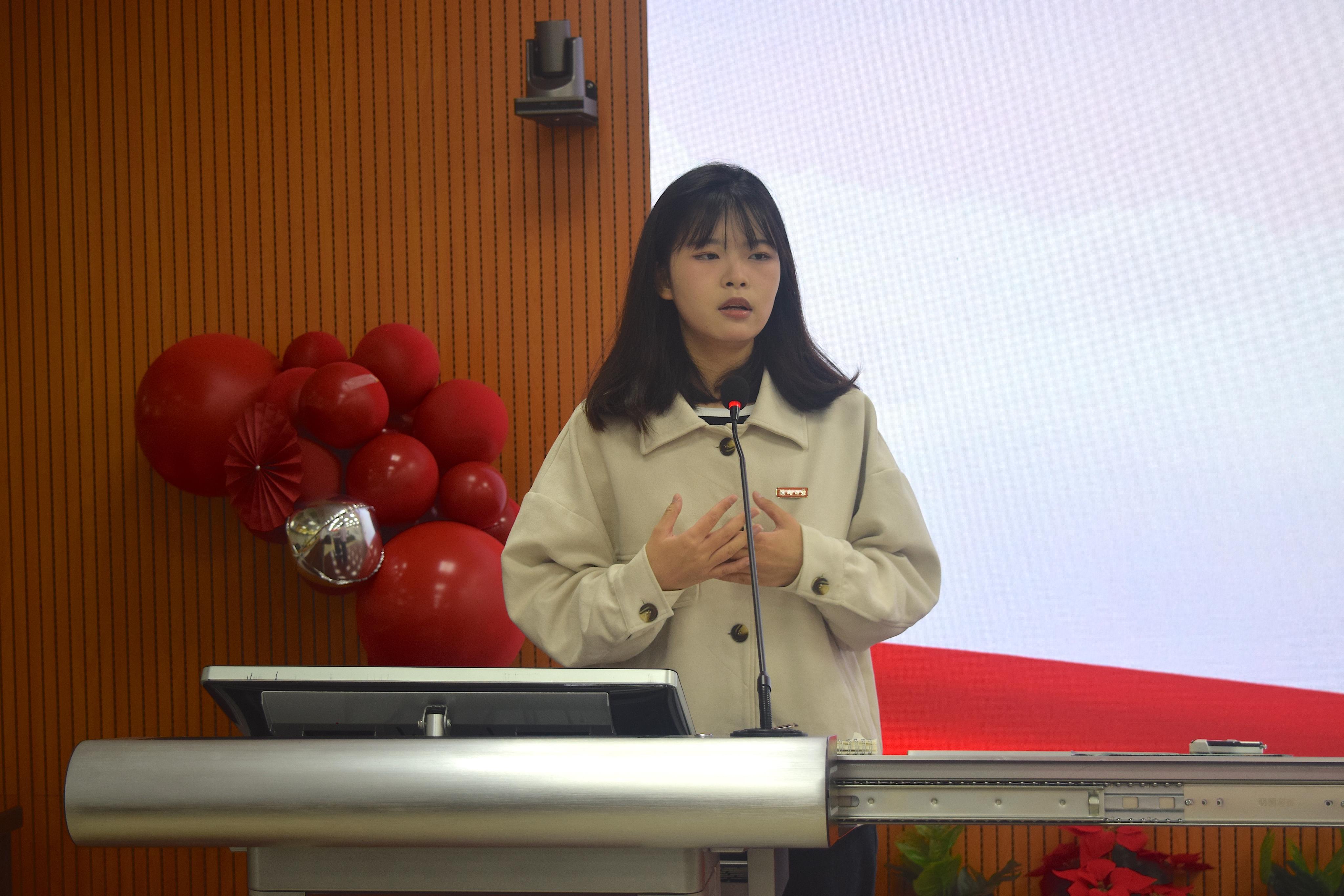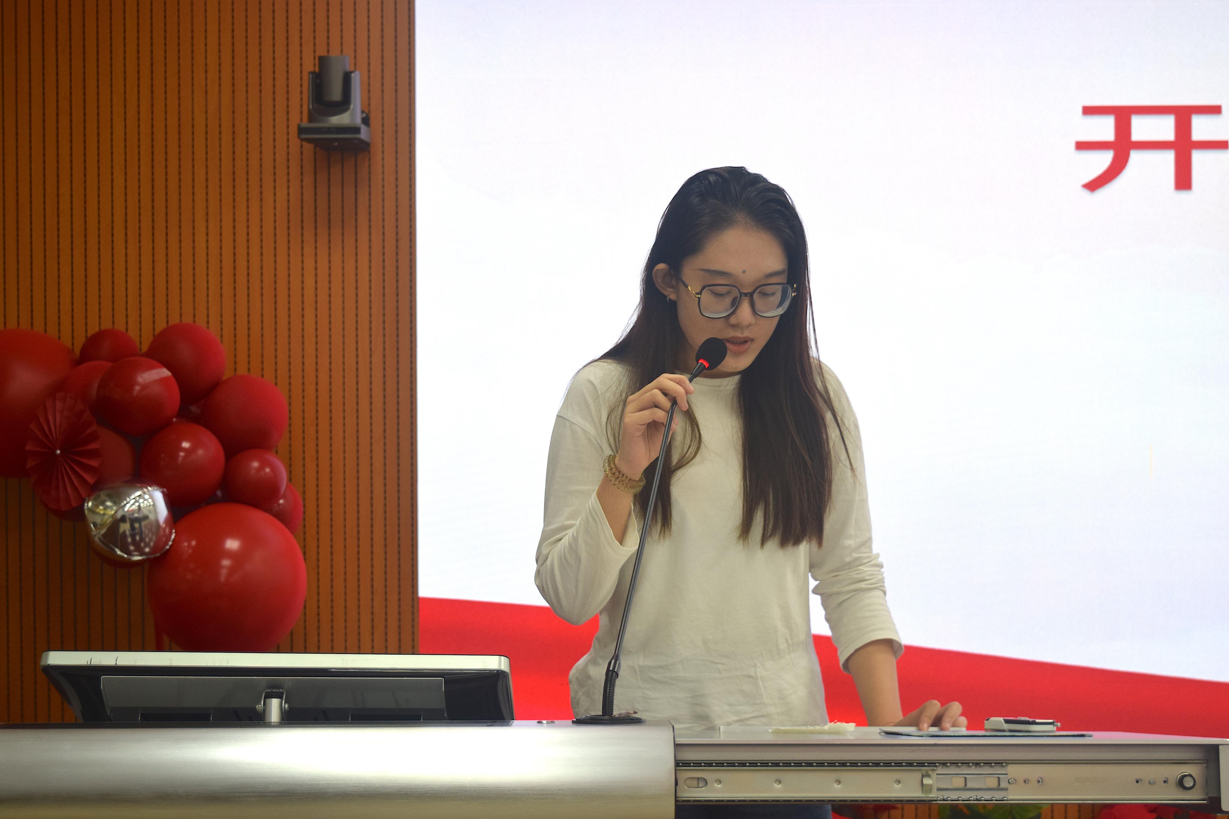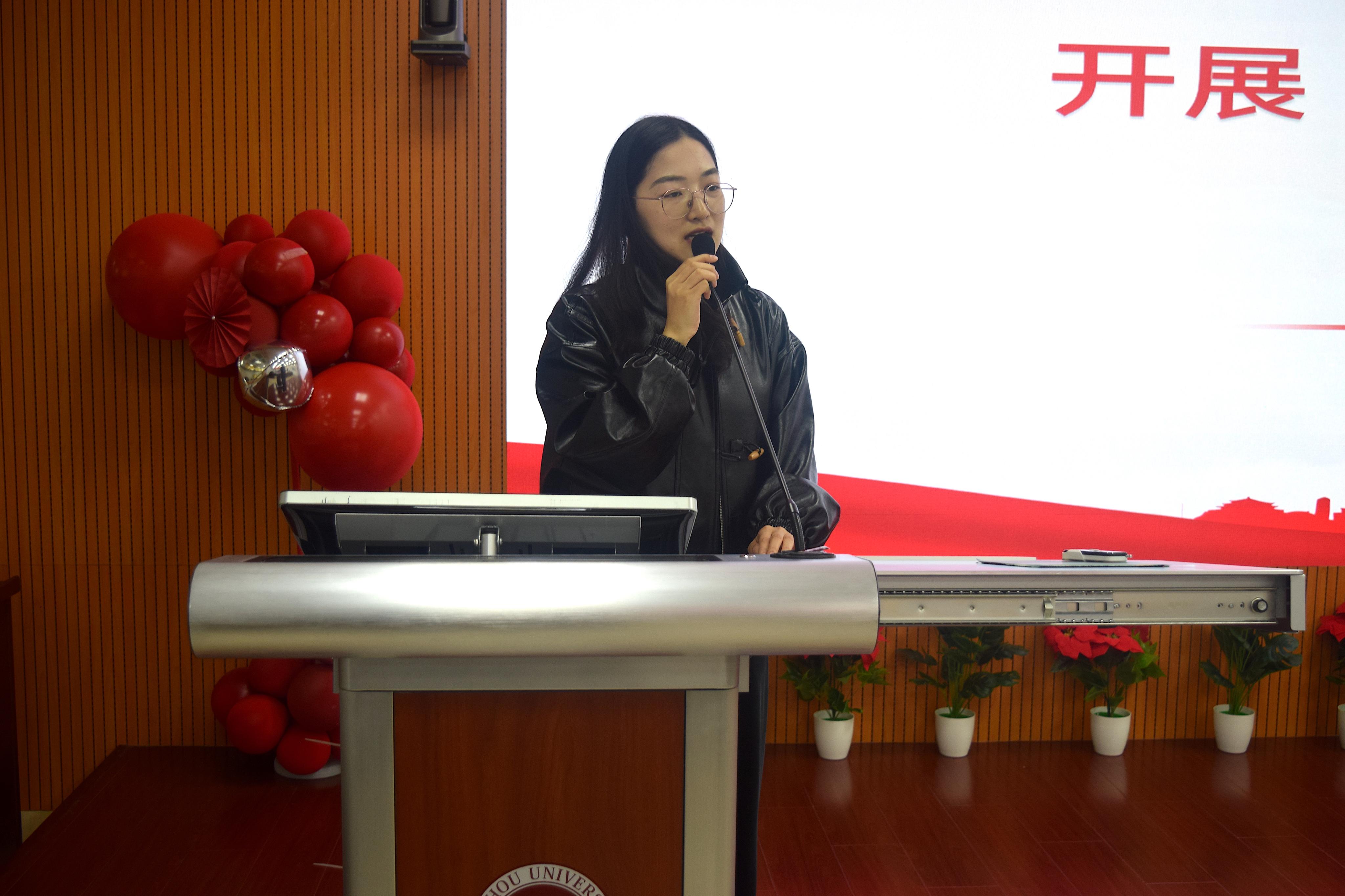学生团委副书记徐珊珊以习近平总书记关于新时代青年的思想引领工作为重要指示,提出在学生工作中应勇担当敢作为,始终牢记服务宗旨,根植同学,积极投身各项学生工作。同时,要勇于自我革命,积极推进我院团委、学生会改革,团结带领我院同学走在时代前列!