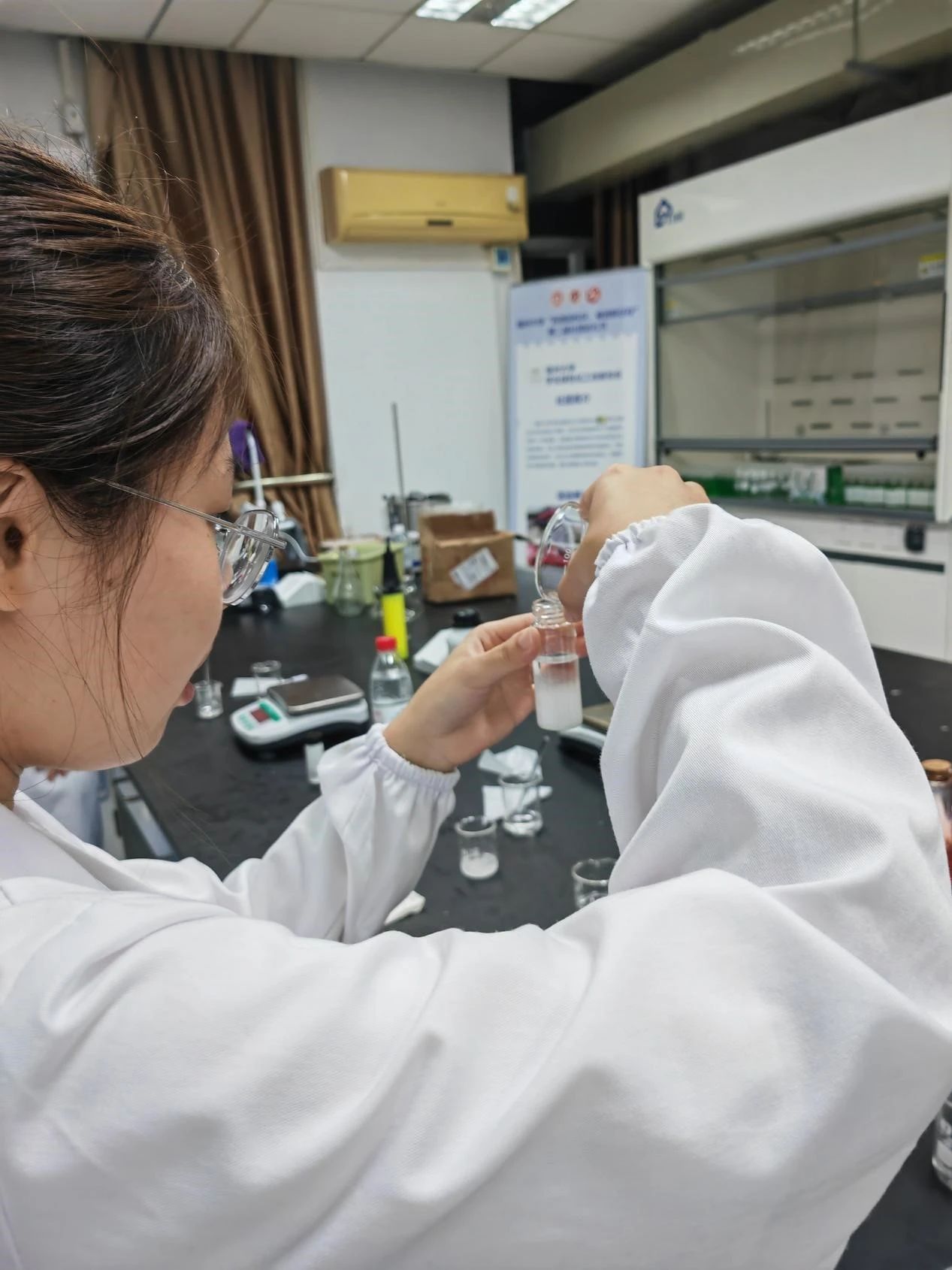 化学一班的同学们身穿白大褂进入实验室,秉着日常实验课程学习中严谨认真的态度,开始动手制作“天气瓶”。