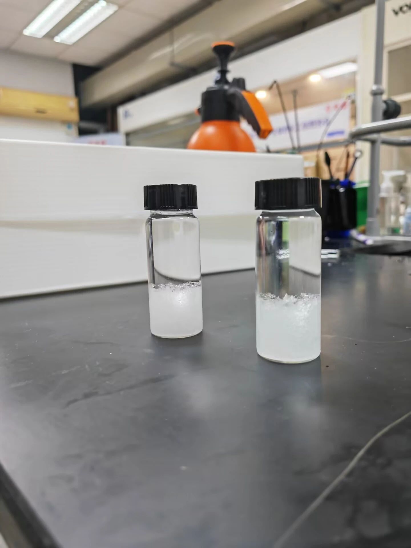 同学们首先把樟脑粉倒入准备好的瓶子,再倒入乙醇,盖上盖子轻轻摇晃,使樟脑完全溶解。接着把钾盐和氯化铵倒入烧杯,倒入蒸馏水并充分搅拌,直到钾盐和氯化铵完全溶解。最后把硝酸钾和氯化铵溶液倒入樟脑溶液中,把盖子和瓶口用纸巾擦干盖紧并静置。