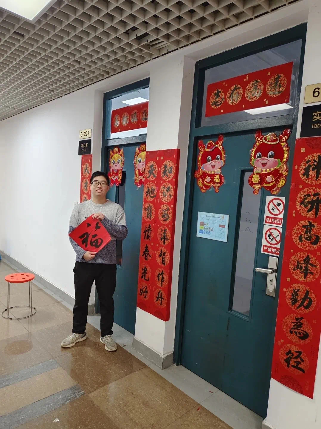 金龙献瑞迎新春,火红灯笼高高挂,校园年味别样浓。漫步在欣欣校园,扑面而来的是浓浓的新春气息,喜气盈盈过新年。留校学子也纷纷为宿舍和实验室装点上春联和福字贴,以科研人的仪式感拥抱崭新红火的未来。