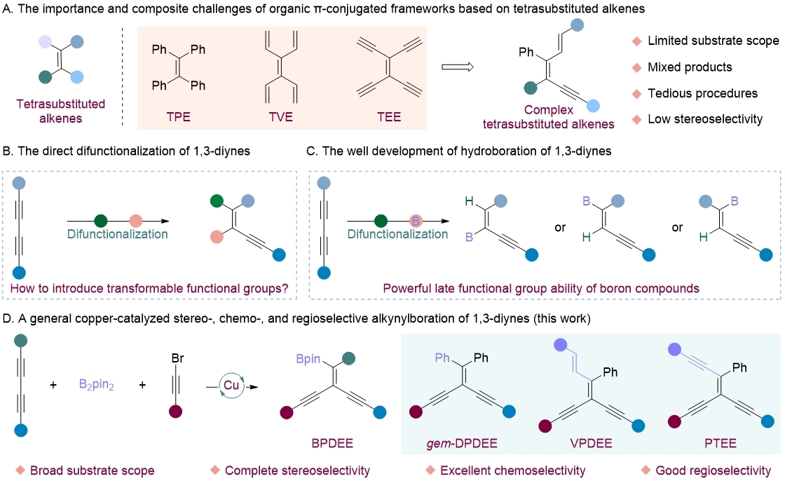 四取代烯烃具有四取代C=C核,广泛应用于材料科学、生物医学和化学。同时它们也是合成功能化合物的有用的化学基元,尤其是四苯基乙烯(TPE)、四乙烯基乙烯(TVE)、四乙炔基乙烯(TEE)及其衍生物在过去的几十年里引起了人们的极大关注。由于它们的有机π共轭骨架在固态和聚集态下具有独特的光学性质,它们已在光电子器件、荧光化学传感器、生物成像和生物传感器中发挥了重要地作用(图1A)。然而,根据之前的报道,现有的复杂四取代烯烃的合成方法需要通过与特定底物(如乙烯基卤化物、炔基卤化物或有机金属烯烃)进行交叉偶联反应来合成,以提供低立体选择性控制的混合产物。在此背景下,Sherburn最近开发了gem-二溴烯烃的多步选择性交叉偶联反应,制备了复杂的四取代烯烃,为获得不同的替代TVE和TEE提供了方便的途径。但随着必要反应步骤的增加,反应的效率会受到影响。考虑到上述问题,开发更直接的催化方法,扩大有机π共轭框架的范围并具有令人满意的立体选择控制是必要的,但仍然是一个巨大的挑战。