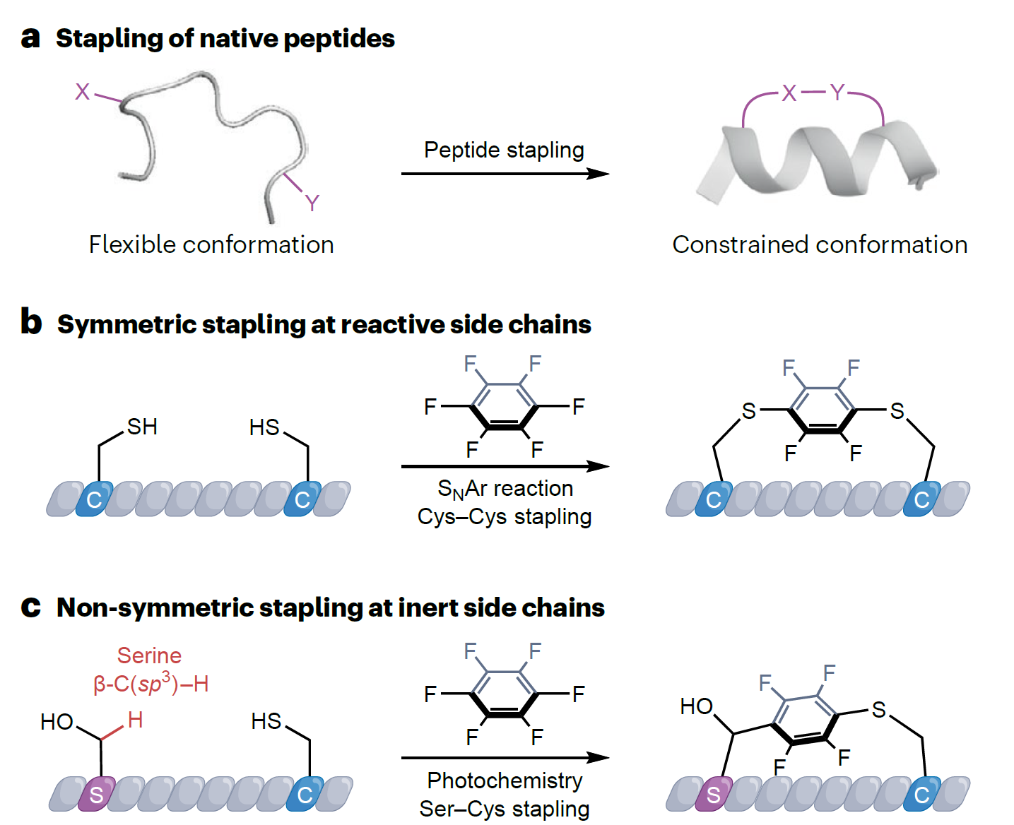 多肽的三维空间结构(构象)对其生物活性和功能具有重要影响。然而,维持短肽的α-螺旋、β-折叠等特定构象是非常具有挑战性的研究课题。多肽装订技术是在20多年前首次由Grubbs、Verdine等人提出并命名,它是用共价键连接两个氨基酸侧链,将肽锁定在特定构象中从而形成环肽。目前主流的天然多肽装订技术是对称装订,关于天然多肽的非对称装订研究较少。