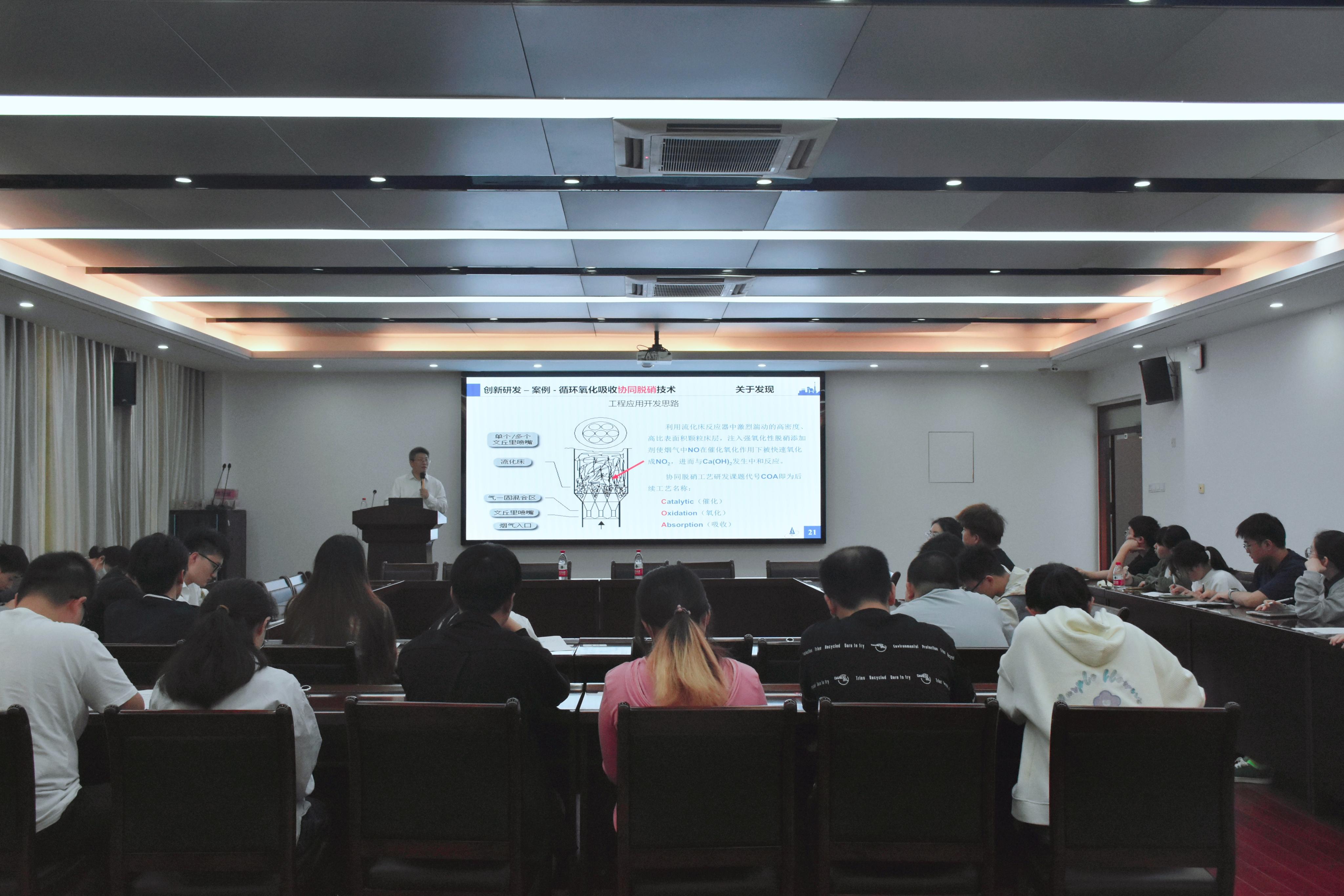 在分享会上,王建春校友以协同脱硝技术为切入点,对当今环境形势进行了深入分析。他运用平易近人的语言娓娓道来,使得原本晦涩难懂的科研原理变得清晰易懂。同学们在他的引导下,不仅感受到了科研的无穷魅力,更深刻地领悟到了将书本上的理论知识应用于生产实践、将实验室的研究成果落地于工业化生产的意义和价值。
