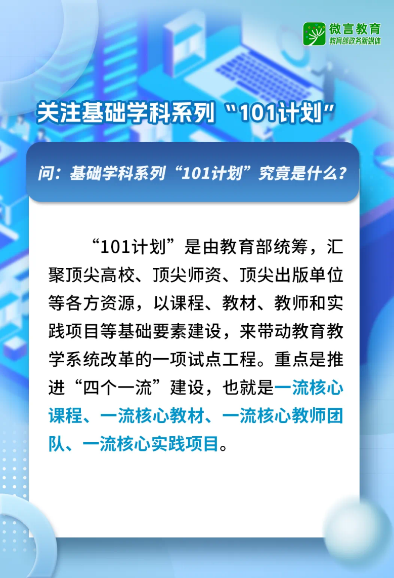 基础学科系列“101计划”是教育部统筹组织实施的本科教育教学改革计划,旨在以课程、教材、教师、实践项目等基础要素“小切口”,牵引解决人才培养“大问题”,带动实现高等教育改革“强突破”,为培养拔尖创新人才筑牢根基。该计划的重点任务是建设一批有高阶性、创新性和挑战度的一流核心课程,一批反映国际学术前沿、具有中国特色的一流核心教材,一支“大先生”领衔的一流教师团队和一批科教融汇产教融合的一流实践项目。据了解,2021年12月,教育部在计算机领域率先启动本科教育教学改革试点工作计划(简称“101计划”)。2023年4月,在计算机“101计划”的基础上,又启动了数学、物理学、化学、生物科学、基础医学、中药学、经济学、哲学等领域的基础学科系列“101计划”。教育部有关负责人表示,基础学科系列“101计划”是拔尖创新人才培养的一项筑基性工程。