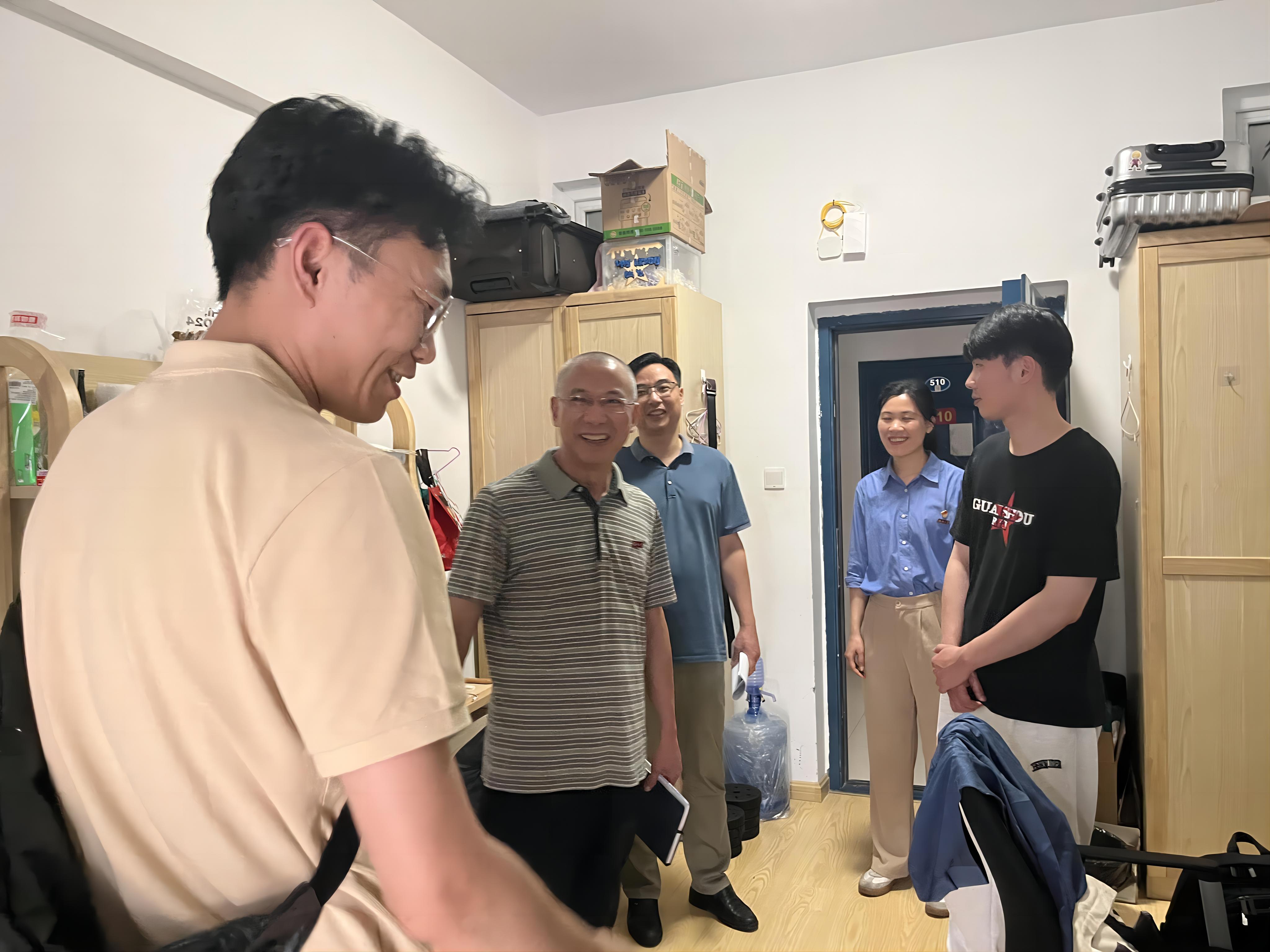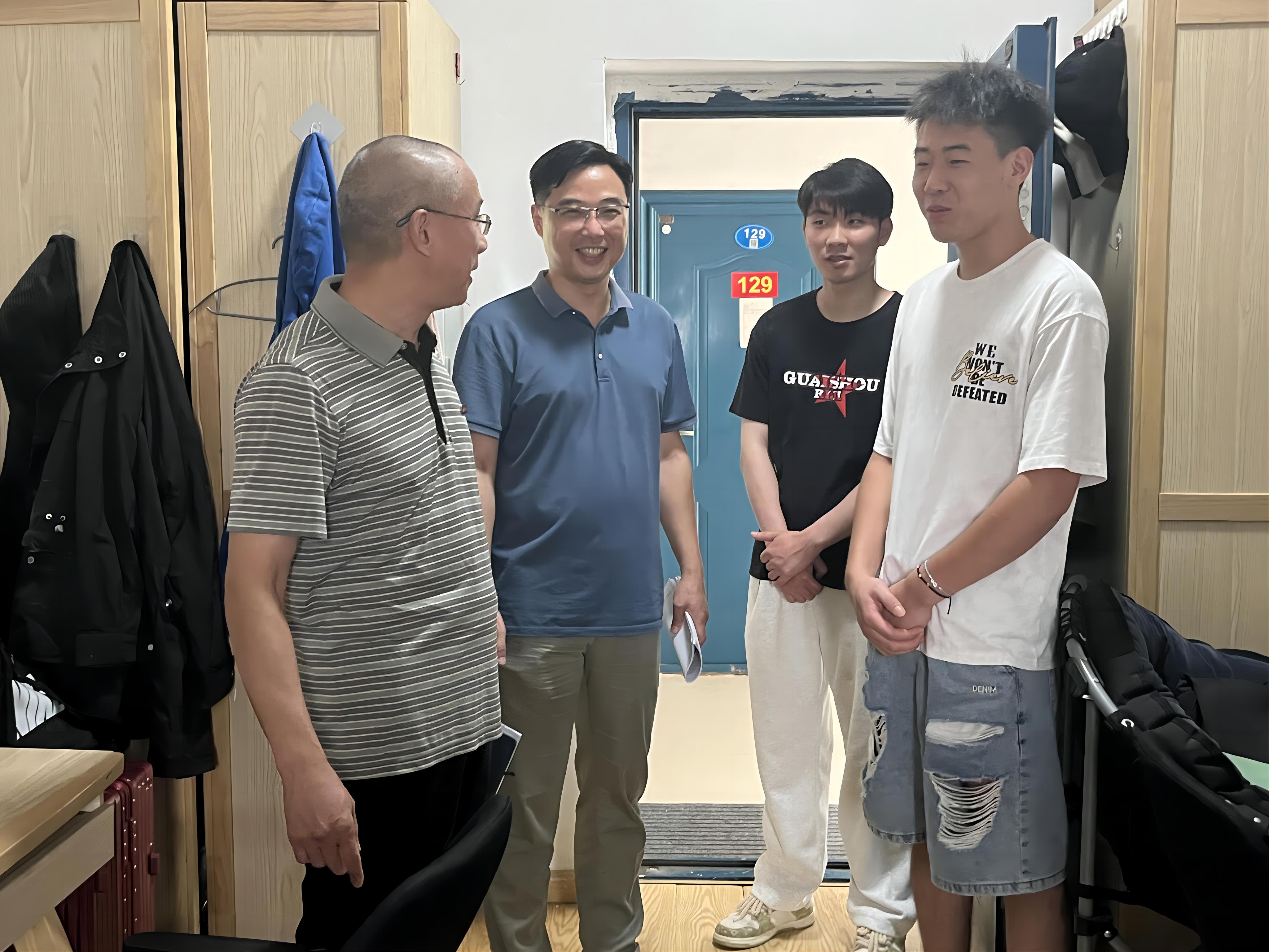 雷石宝处长、林勇副处长深入61号楼学生宿舍,与同学们面对面亲切交流。他们详细询问了同学们的学习、生活情况,倾听同学们的心声,现场解答同学们的问题和困惑。他们的关心与叮嘱,让同学们充分感受到学校与学院始终是他们坚强有力的后盾。