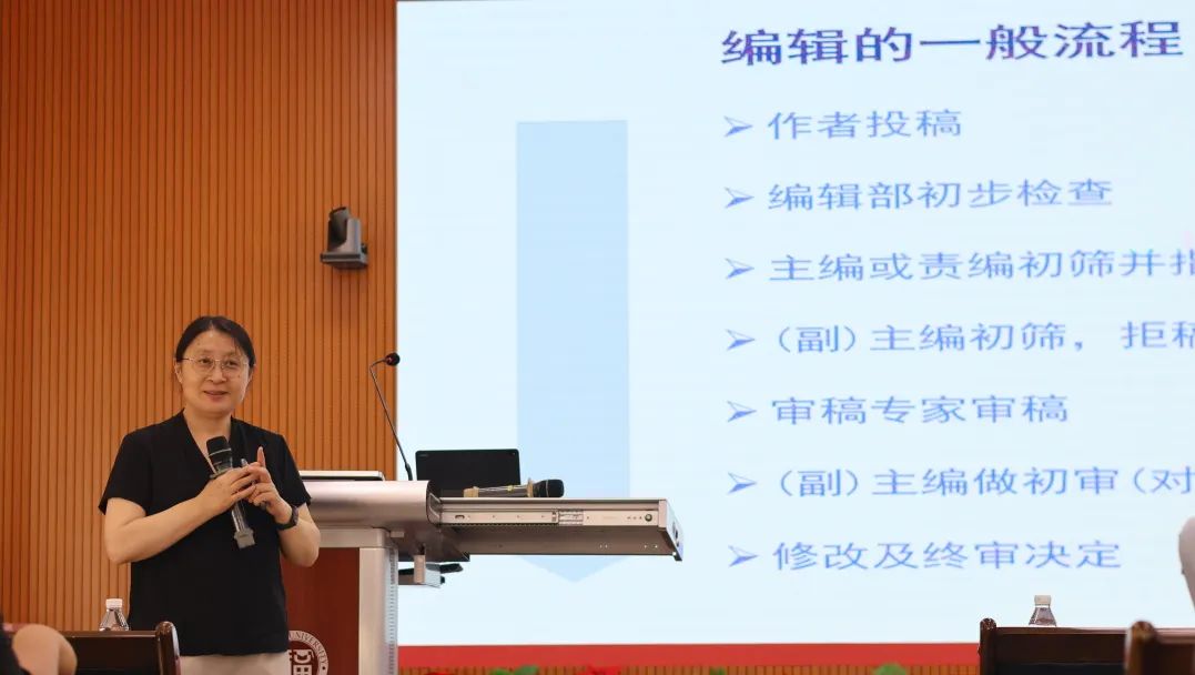 “大家在写专业期刊时一定要开门见山、开宗明义”,李彦教授建议大家从审稿人和期刊编辑的视角出发撰写论文并根据文章内容选择合适的期刊发表,在开篇迅速进入主题,做到有效沟通。紧接着,她详细地为在场师生介绍了编辑的一般流程,帮助大家开阔眼界,从更高视角看待论文写作。