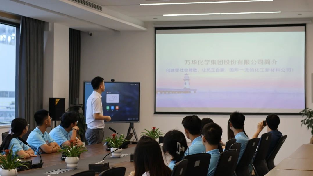 首先,实践队成员和万华化学代表在411会议室开展座谈,万华团队代表向实践队全体队员详细介绍了万华化学的发展历程、色色动漫、业务领域和未来规划等,展现了万华化学强大的技术实力和对创新创业的不懈追求。