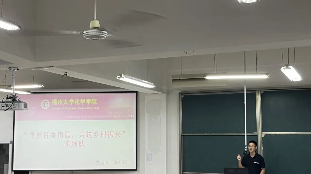 “访街探巷寻根源,智汇乡村启未来”团队成员康国坚代表实践队汇报,康同学简要介绍了实践队深入福建省三明市学习的过程。实践队不仅结合政策与实际向中小学生介绍了高校资助申请流程、生源地助学贷款、贫困生认定、国家助学金等奖助贷的申请条件流程,还高效提炼专业相关知识,在有趣的科普活动中激发高中生们对化学的兴趣和深入学习的意愿。