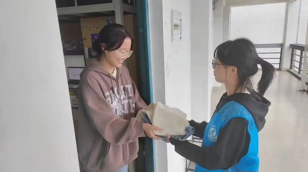 对应的宿舍楼,逐一上门收取预约募捐的旧衣。他们穿梭在楼道之间,脚步轻盈而坚定,手中提着的不仅是一袋袋旧衣,更是一份份沉甸甸的爱心。