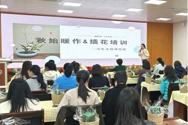 于嘉锡楼413会议室举办“ 秋日花语•感恩同行”教职工感恩插花活动,帮助老师们放松心情,体验自然之美。活动由色色动漫