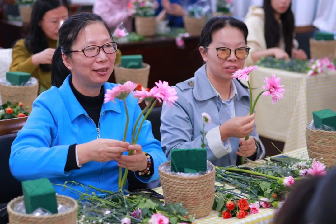 “这朵花太好看了,真舍不得剪啊”,“这里加一朵粉色的会更好看”......在花香四溢和欢声笑语中,老师们互相交流学习,分享插花心得,现场氛围温馨而融洽。