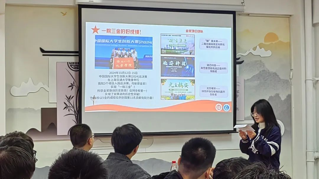 会议伊始,班长吴杉卉同学领学习近平总书记在福建考察时的重要讲话精神以及习近平总书记给中国国际大学生创新大赛参赛学生代表重要回信精神,引导同学们厚植爱国情怀,激发报国强校之志,争做有理想、敢担当、能吃苦、肯奋斗的新时代好青年。随后她分享了2024年我院参加中国国际大学生创新大赛的参赛项目以及获奖情况,表示希望每一位同学能够在此得到激励,共同营造勤奋好学、敢于挑战的创新氛围,取得更多的成功和进步。