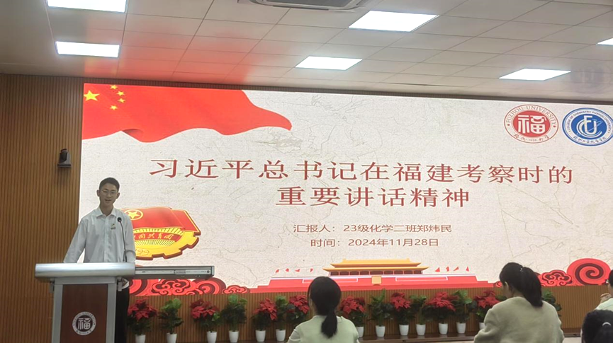 本科学生团委副书记郑炜民结合福建特色与学员们分享了学习习近平总书记在福建考察时重要讲话的心得体会。他指出总书记本次讲话强调了福建要深入贯彻党的二十大和二十届三中全会精神,举出总书记重访漳州市东山县陈城镇澳角村、考察谷文昌纪念馆、关注文化遗产保护等事例,表示自己感受到了习近平总书记对福建省全面深化改革开放和创新型人才培养的殷殷期盼,体会到了“扭住目标不放松,一张蓝图绘到底”的丰富内涵,希望与学员们共同学习进步。