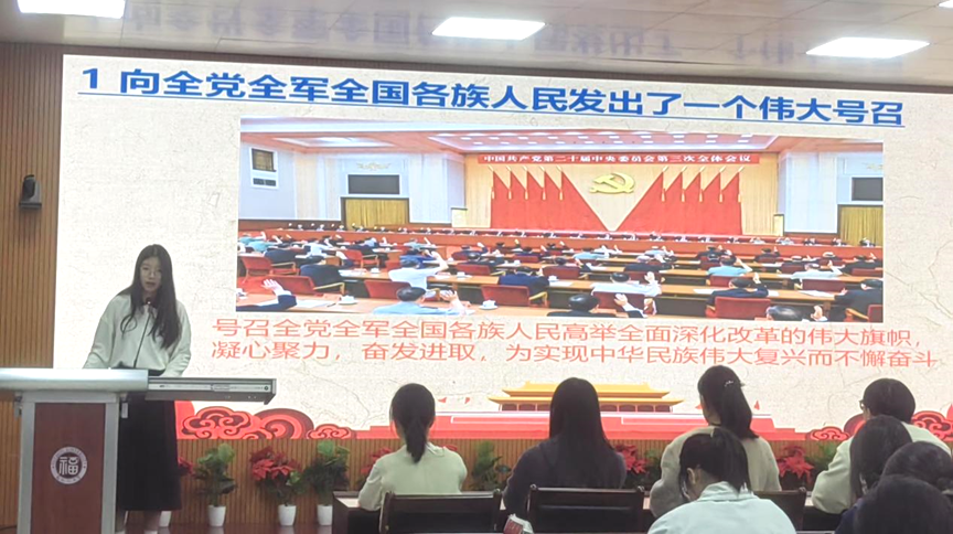 本科学生团委副书记陈晓颖分享了对党的二十届三中全会精神的学习。她从党的二十届三中全会的报告内容切入主题,并结合我院院训——筚路蓝缕,守正创新,阐述了她对于习近平总书记强调改革落实和守正创新重要性的理解,鼓励学员们坚持守正创新,始终走正道、善于闯新路。最后她详细从多个方面总结了党的二十届三中全会的意义,并向学员们推荐了一些阅读书目,帮助同学学习青年人在时代发展中的重要意义。