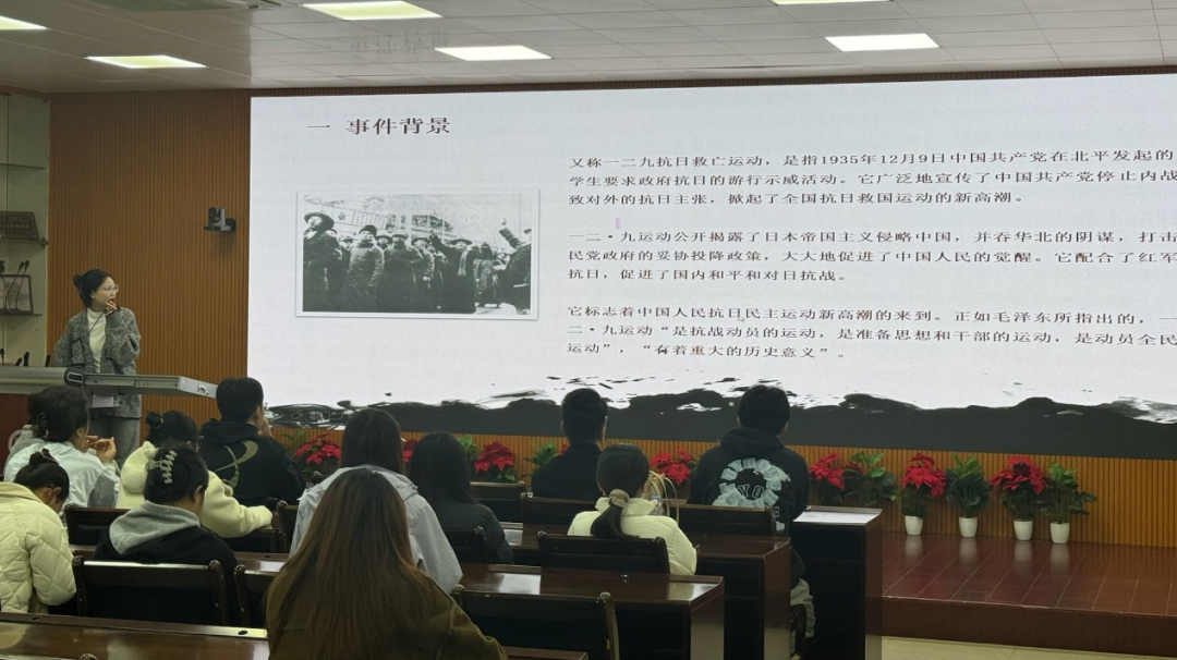 在观影现场,首先由学院研会党建部负责人带领大家一起回顾了“一二‧九”运动的壮丽画卷。1935年12月9日,这一天,成为了中国近代史上一个不可磨灭的印记——“一二‧九”运动爆发。数千名北平的大中学生,不畏严寒,不惧强权,走上街头,举行抗日救国示威游行,反对华北自治,反抗日本帝国主义的侵略,要求保全中国领土的完整。那是一场由青年学生发起的抗日救亡运动,他们用自己的热血和青春,书写了中华民族不屈不挠的抗争史。