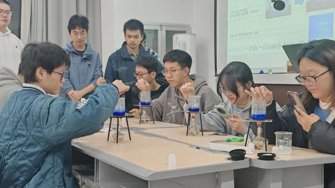 在科普实验正式开始前,化学爱好者协会的成员们早早来到现场,做好物料准备与摆放工作,组织到场学生分组落座。同学们共同讨论实验方案,明确实验的注意事项,确保制作蓝晶雨的实验安全有序。