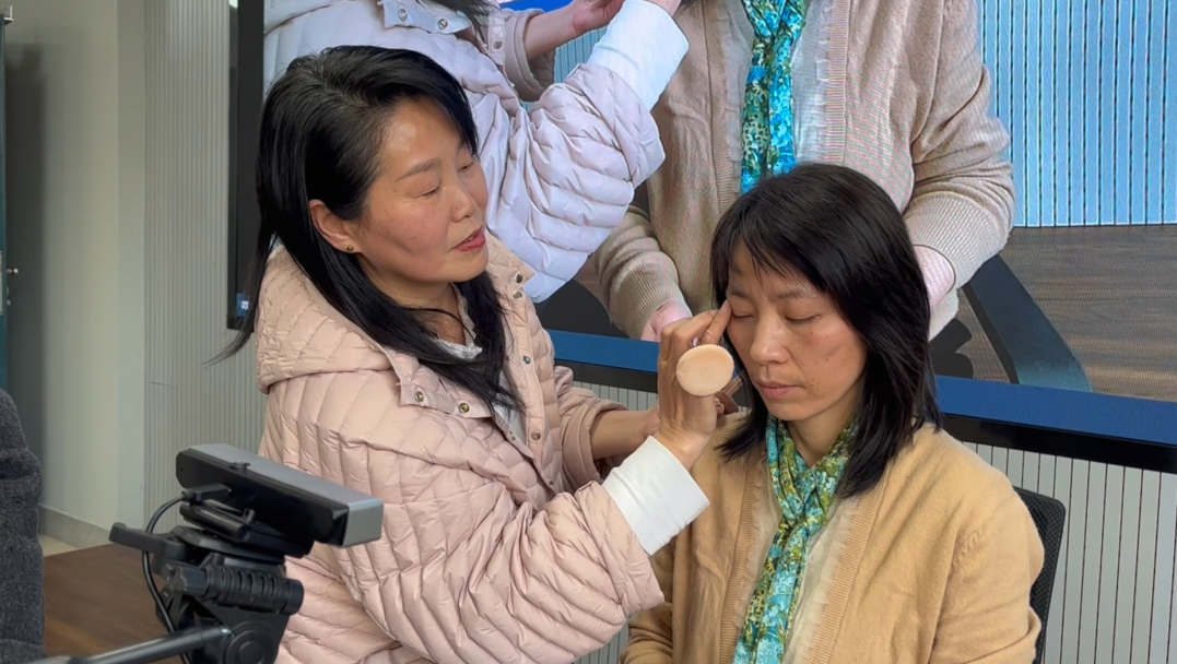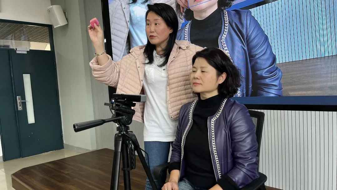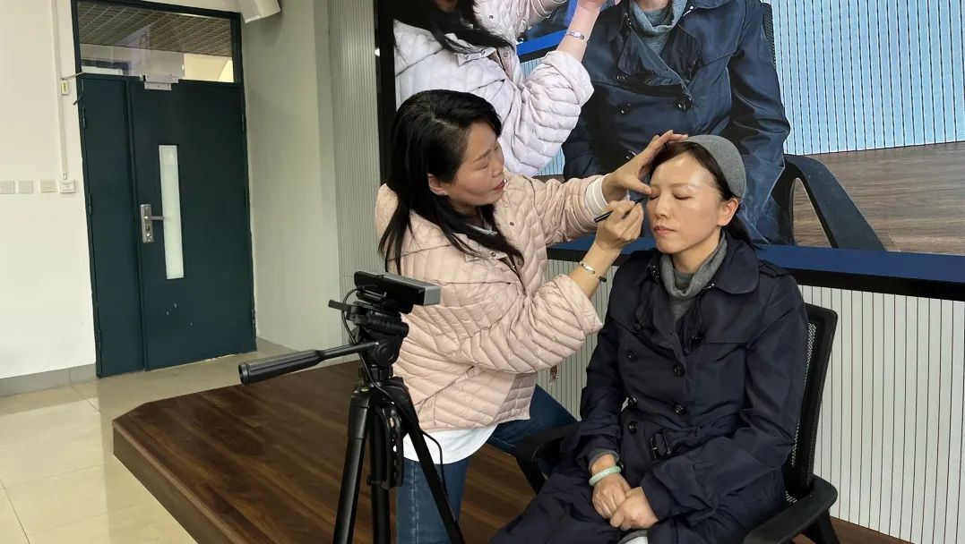 互动环节中,教师们争相将自己在化妆方面遇到的困惑一一抛出,提出“眼袋/黑眼圈遮瑕”“野生眉过密调整”“倦容肌焕亮”等问题,陈老师细致解答,分享了“通过冷暖调遮瑕膏叠加、在视觉上实现去眼袋”“依据鼻翼到外眼角延长线定眉长”“从眉峰处下笔而非从眉头画至眉尾,避免眉头紧锁”等实用妙招,现场掌声、欢笑声交织成片,气氛热烈。女教职工们不仅学到实用的化妆技能,在相互交流中还收获了满满自信,激起对美好生活的追求和热爱。