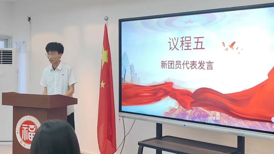 2024级本科生廖梓墨同学作为新团员代表发言。他表示,成为一名共青团员不仅是身份的转变,更需以高标准要求自己,在学业、生活、社会服务中积极作为,以实际行动践行“强国有我”的誓言。