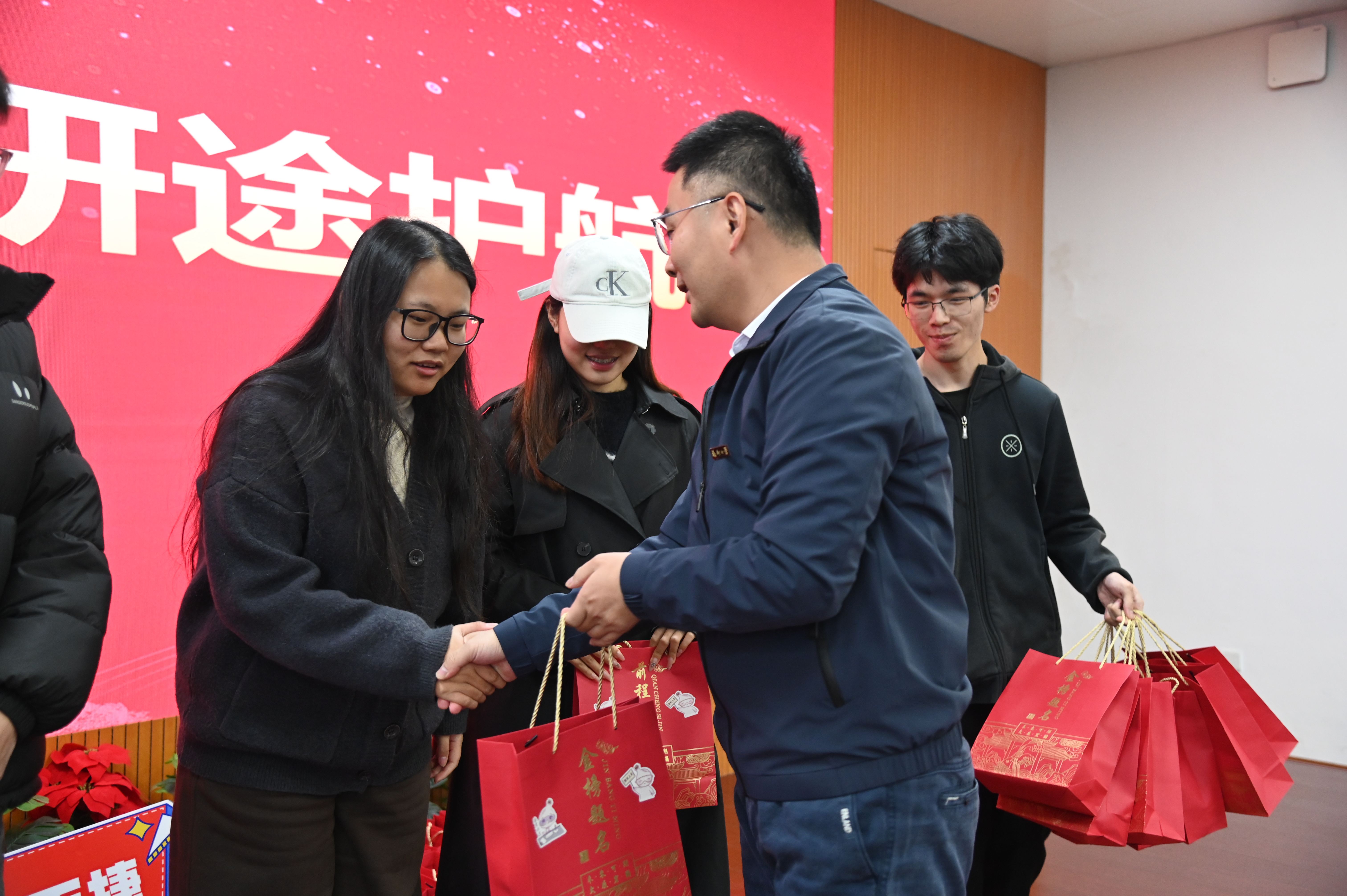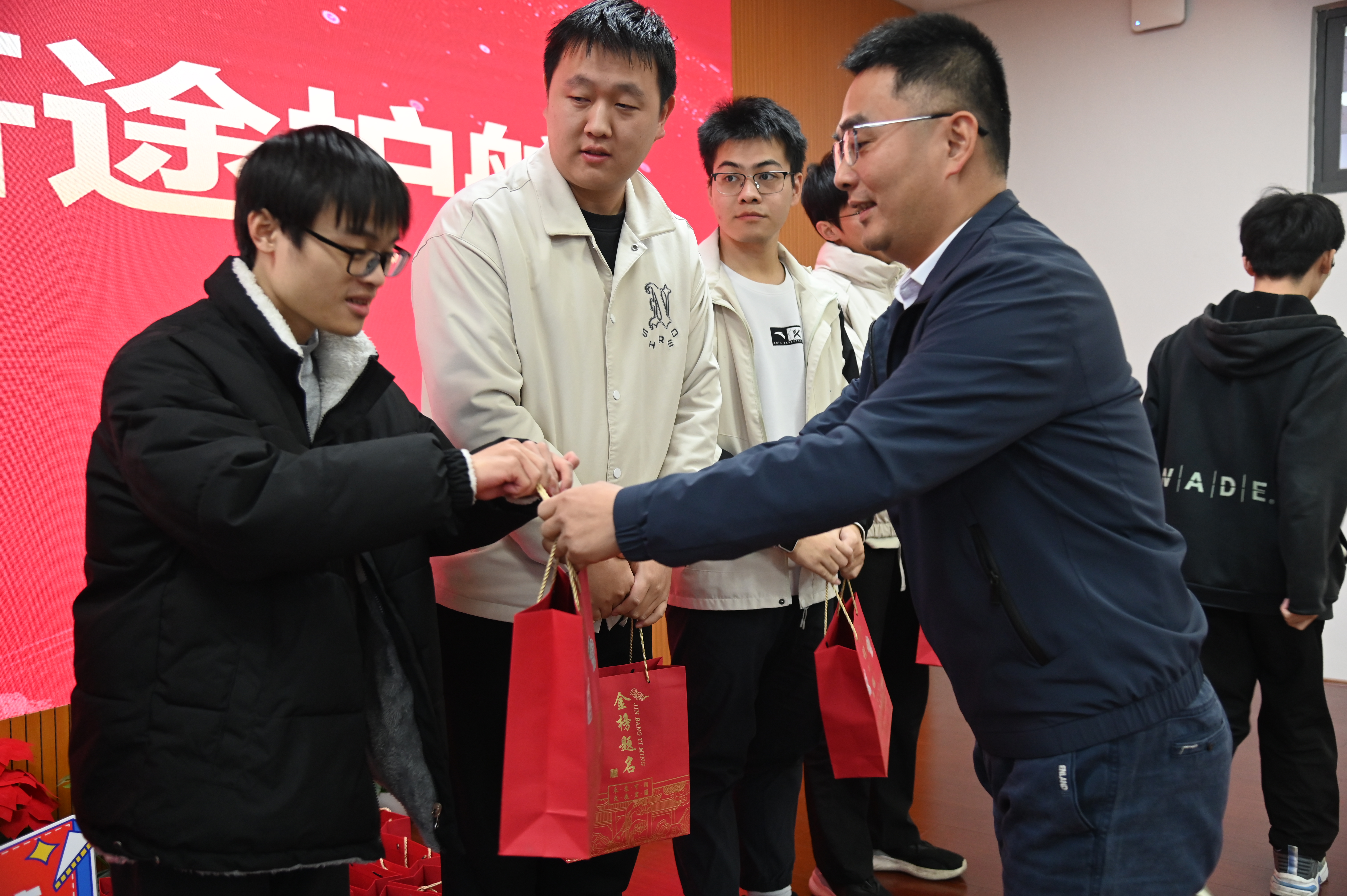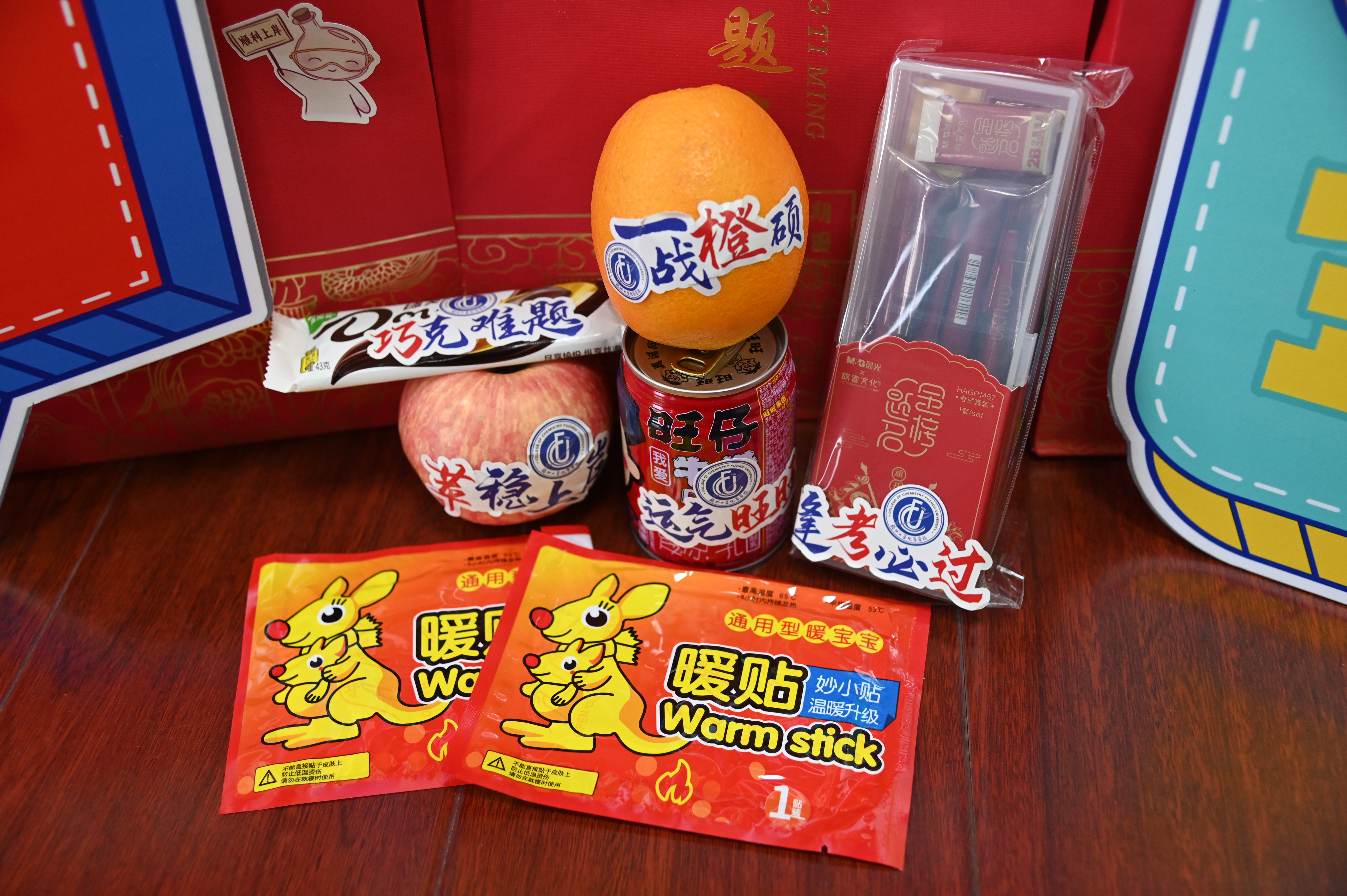 暖心寄语过后,柯江锋副书记亲手将考研暖心礼包递到每一位学子手中。礼包内含有寓意美好的小礼物:“备考思路旺、答题发挥旺、一路开挂旺”的旺仔牛奶;象征“心想事成、平安上岸”的新鲜橙子和苹果;代表“巧”克难关、“力”争上游的巧克力;还有一套实用的文具,则承载着“笔下生辉、金榜题名”的期盼。