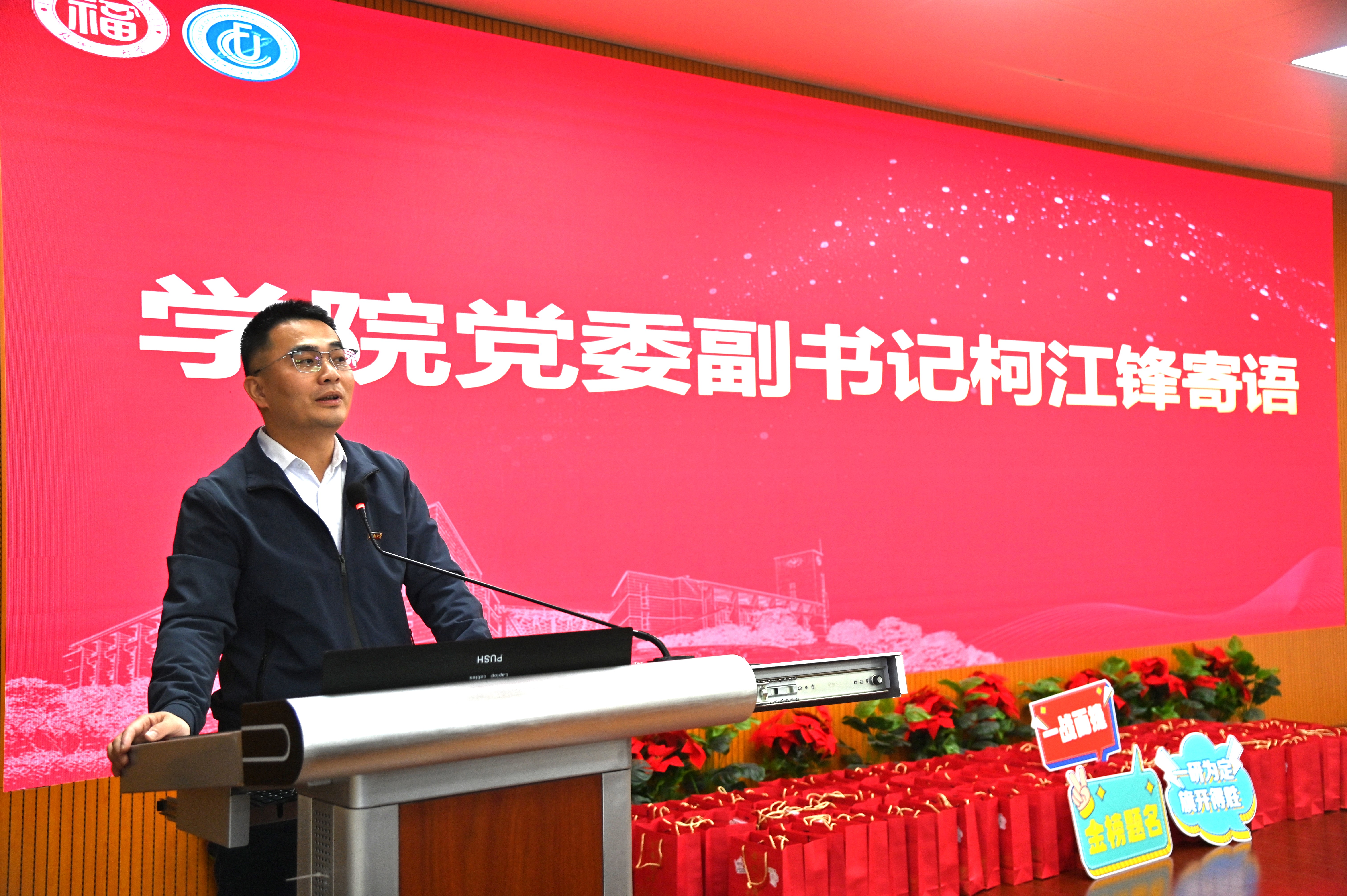 随后,柯江锋副书记为同学们带来暖心寄语。他首先对同学们备考以来的坚持与付出给予高度肯定,为同学们一路披荆斩棘的毅力感到骄傲。同时,他着重强调考场纪律,提醒同学们严禁携带电子设备进入考场,务必严守考试规则。最后,他鼓励同学们坚持到底,珍惜每一场考试的机会,稳扎稳打,放平心态轻松应考,用最好的状态冲刺,并祝愿全体考研学子旗开得胜,成功考入理想院校。
