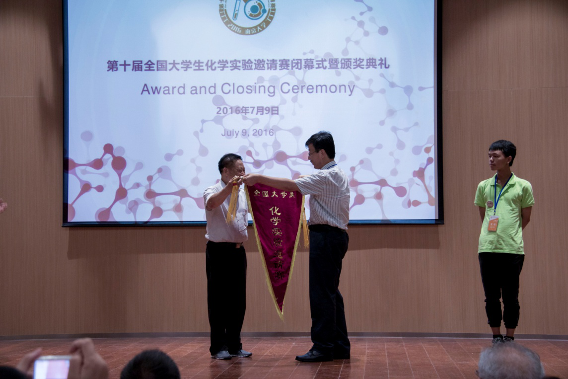 2016年7月6-9日,由教育部高等学校化学教育研究中心主办的“第十届全国大学生化学实验邀请赛”在南京大学仙林校区举行,全国43所高校的129名大学三年级的化学类专业学生和200余名大学化学实验教学的专家与教师参加了本次实验邀请赛。竞赛内容主要包括实验理论笔试和实验操作考试。实验理论笔试的考察范围主要是化学实验理论知识、化学实验操作规范、化学实验室安全知识等。实验操作考试的考察范围主要是化学实验基本技能、实验设计与操作、数据采集和分析、常规和大型仪器的使用、图谱解析、实验总结与报告等。邀请赛中,参赛选手统一参加理论笔试(两个小时)后,通过抽签从无机及分析化学实验、有机化学实验、物理化学实验三个科目中选择各自的实验科目,分别进行实验操作竞赛(八个小时)。这种赛制能够比较客观地体现学生的综合实验技能和理论知识水平,保证大赛的公平、公正。同时,也可从一个侧面反映各高校化学实验教学的总体情况。选手的比赛总成绩由笔试成绩(30%)和实验操作成绩(70%)两部分形成。学生的成绩评定以及分配分别是:金奖 15%,银奖25%,铜奖35%。