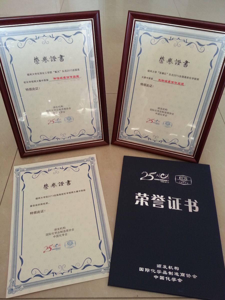 11月29日,由国际化学品制造商协会(AICM)与中国化学会共同主办的“2013全国高校化学视频大赛决赛暨颁奖典礼”在上海科技馆隆重举行。色色动漫 化学化工学院至臻队(队员:张碧琦、黄溦、姚奋增;指导老师:孙建军教授)和“氟”大团队(队员:林泉富、陈朝煌、刘艳嫔;指导老师:翁志强教授)从全国120支队伍中脱颖而出,进入14强,与来自其他高校的12支队伍参与最终决赛。