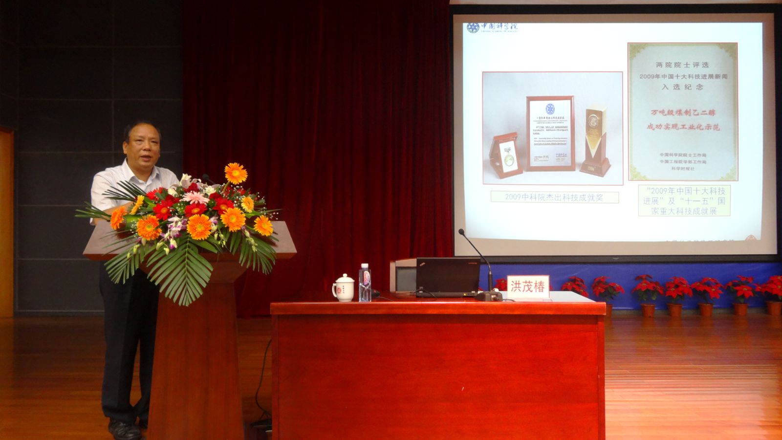2013年10月19日下午,著名无机化学家、中国科学院院士、中国科学院福建物质结构研究所所长洪茂椿院士莅临我校,在图书馆明德厅为化学化工学院师生带来一场题为“化学前沿与变革创新“的学术报告会。化学化工学院270名师生参加了本次报告会,会议由学院院长王绪绪教授主持。