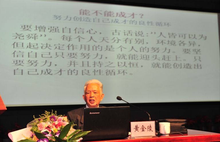 黄金陵教授结合自己的学习、工作经历,从什么是“中国梦”、如何实现“中国梦”,“为什么成才”、“能不能成才”、“如何成才”五个方面为2013级新同学们带来一场内容翔实、意义深远的报告。对于“为什么成才”,黄教授指出,在这个国家欣欣向荣的时代,大家的梦想不能仅停留在个人的梦想上,要同“中国梦”联系起来,为实现“中国梦”而共同努力。对于“能不能成才”,黄金陵教授认为,立志是成才的基础,自信心的建立则是成才的必经之路。他以切身经历,鼓励同学们相信自己、努力奋进。随后,黄金陵教授就“如何成才”问题与新生进行了深入的探讨,他认为勤奋是成才的唯一途径,并对同学们提出几点建议:一是要有明确的学习目的性;二是要端正学习态度;三是要严格要求自己;四是要养成良好的学习习惯;五是要善于开动自己的头脑;六是要积极参加讨论课和听老师辅导答疑;七是要对阶段学习内容及时加以总结。最后,黄金陵教授向同学们介绍了历时14年的新型抗癌光敏剂“福大赛因”的研发过程及效果,并与在场学生积极互动,解答同学们对大学学习、校园生活等方面遇到的问题,报告会在一片片热烈的掌声中落下帷幕。