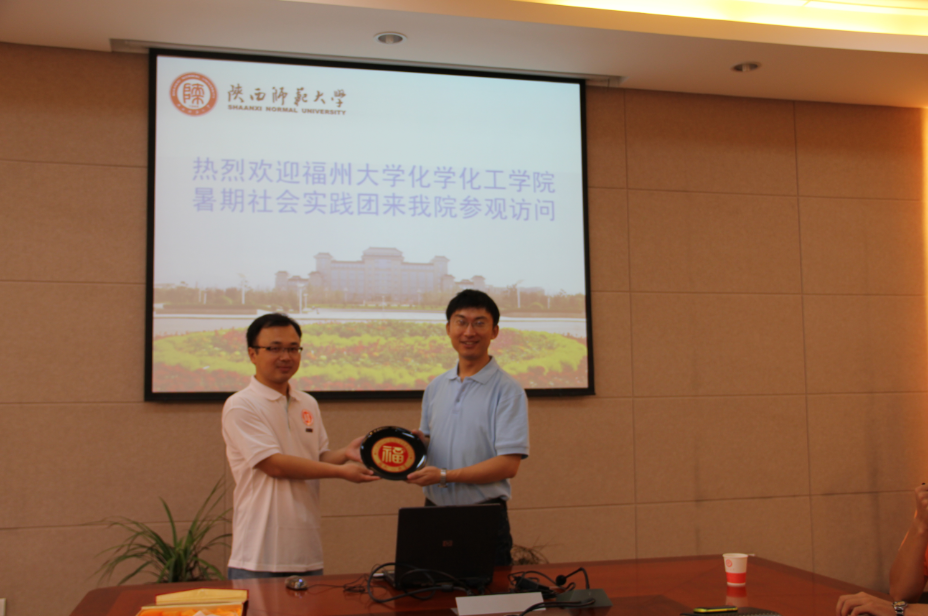 化学化工学院暑期社会实践团一行20人在学院2010级本科生辅导员朱振宁、2012级研究生辅导员陈艺全、2011级本科生辅导员华琴、2011级研究生辅导员蒋麓的带领下来到陕西师范大学化学化工学院进行访问交流。学院党委副书记王启明、实验中心主任杨文玉、2011级辅导员谢遵园、2010级辅导员牟朝丽及部分学生代表热情接待了我院师生。
