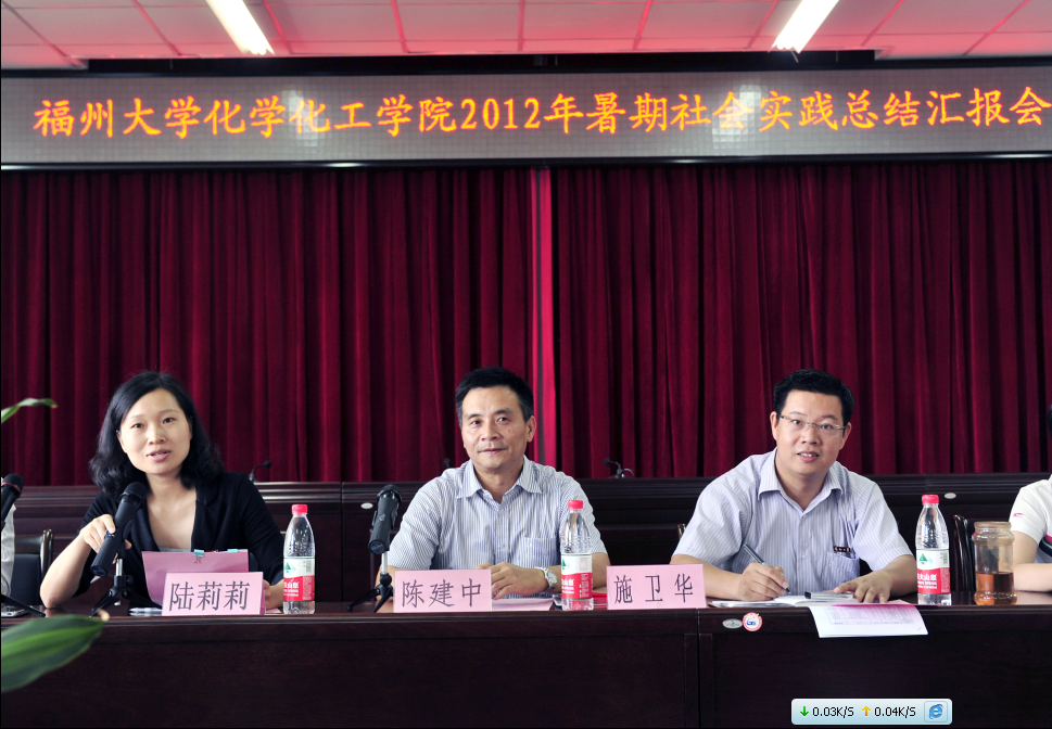 10月10日下午,化学化工学院2012年学生暑期社会实践总结汇报会在嘉锡楼413会议室举行。常务副院长、博士生导师陈建中教授、学院党委施卫华副书记、实践指导老师李奕副教授等老师出席了汇报会,实践团成员和低年级学生代表参加了汇报会,会议由学院团委书记陆莉莉主持。