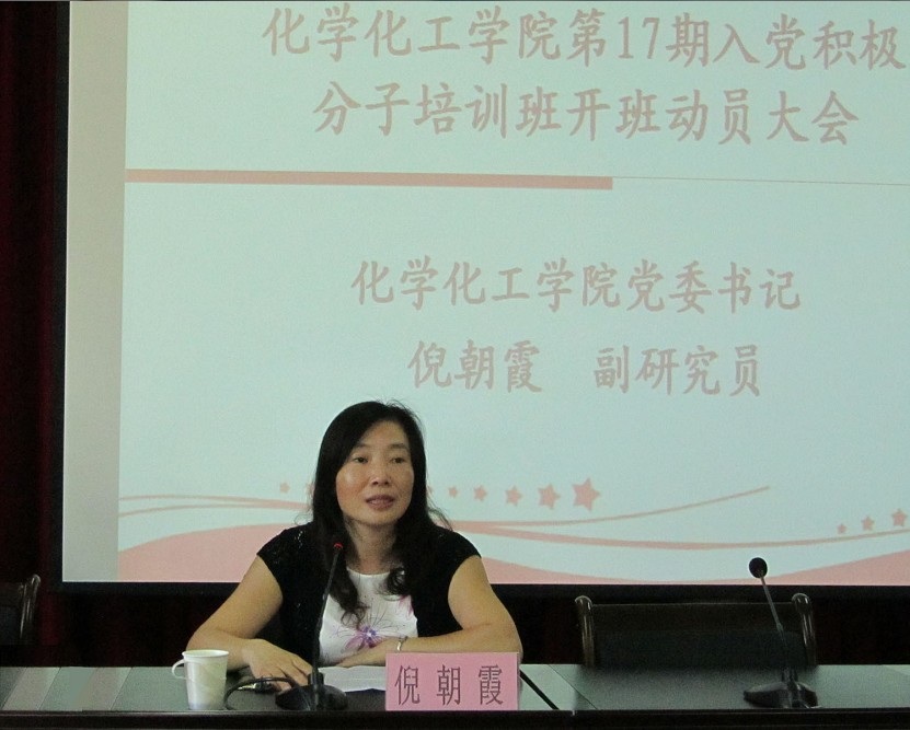 2012年10月13日上午9点,化学化工学院第17期学院分党校于嘉锡楼413开班。出席本次分党校开班仪式的有学院党委书记倪朝霞老师、院党委副书记施卫华老师、10级辅导员朱振宁老师以及11级辅导员华琴老师。首先,党委书记倪朝霞老师致开幕词,她对前来参加培训的积极分子表示热烈欢迎,向学生们阐明了学院分党校培训的目的与意义,并对新学员们提出了三点希望与要求:第一,把握机遇,勤奋学习;第二,突出重点,讲究方法;第三,坚持宗旨,创先争优。希望新学员们能珍惜这每一次的学习机会,并在今后的学习中不断提高自己,争取早日成为一名合格的共产党员。最后倪书记预祝此次培训会取得圆满的成功。