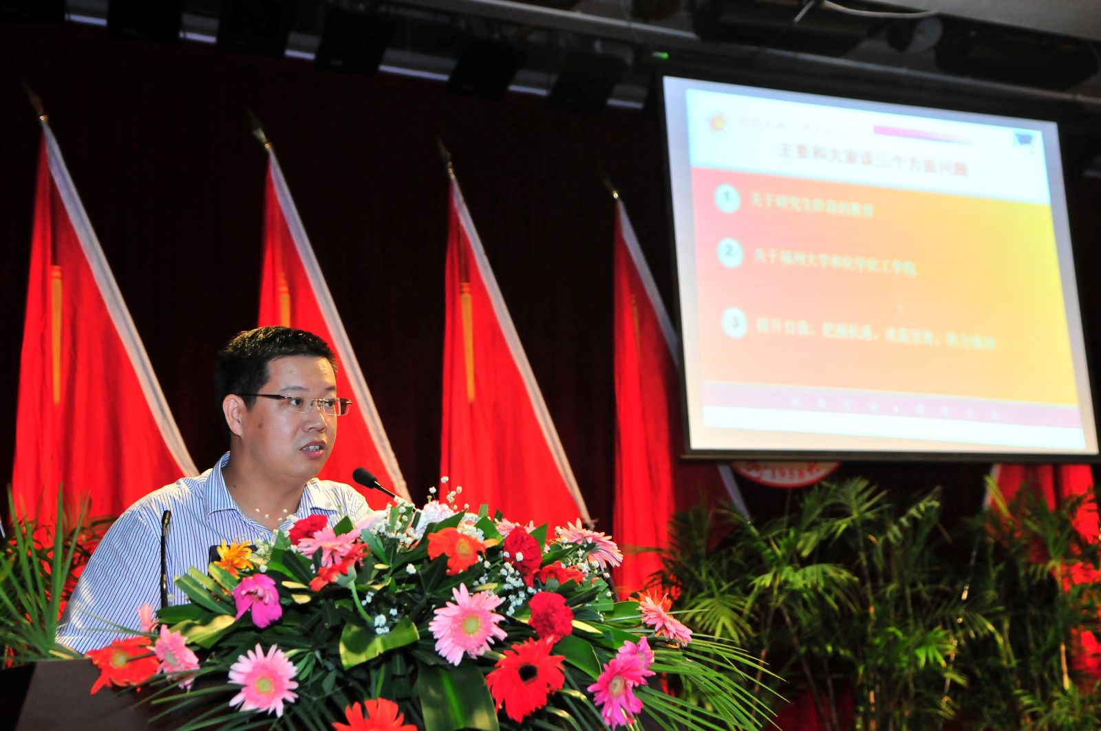 与化学化工学院、如何提升自我三个方面进行细致的介绍,让新生们对研究生阶段的教育特点有个大致了解,对校情校史有了具体的了解、对化学化工学院的专业特色、师资力量及学术氛围有了清晰的认识。之后,施卫华老师着重从研究生角度出发,以“提升自我、把握机遇、求真至善、助力成功”为主题,提出三点注意事项。一是,研究生阶段会遇到的机遇与挑战。读研期间必然要面对学习、生活与就业方面的压力,同学们一定要调整好心态,积极面对。二是,研究生应当具备的能力。挫折是磨练人的最好药剂,我们应当牢记“筚路蓝缕”的院训,以艰苦奋斗、严谨求实、勇于拼搏的精神为动力,不断提升科研能力,做到把握机遇,求真至善。三是,处理好几种关系。包括压力与动力的关系,学业与情感的关系,研究生与导师的关系,以及志存高远与始于足下的关系。最后施老师勉励大家要不断探索,务实研究,创造属于自己的辉煌!