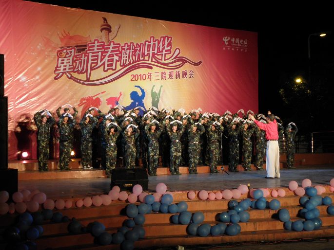 晚会共分三个篇章 “翼动青春”,“阳光校园”和“献礼中华”。在“翼动青春”这个篇章中,既有10级新生带来的《新生歌曲串烧》动感十足,也有新老生合作的《我的大学生活》亲切动人,还有充满青春活力的学生T台秀。尤为别具一格的施能民教授带领新生带来的合唱《打靶归来》,一时间将会场气氛推向了高潮。