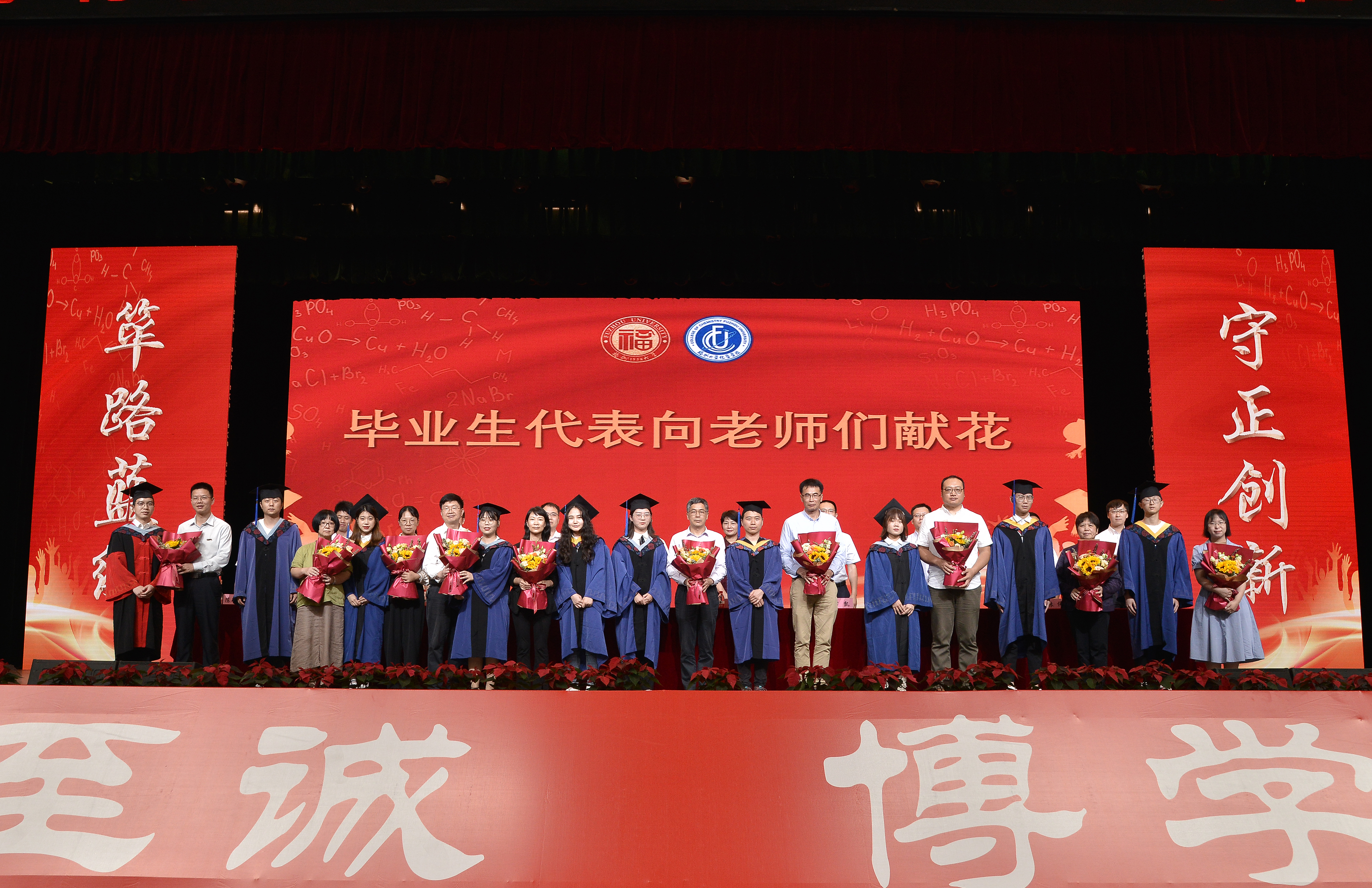 的求学路上,师长的谆谆教导让同学们在感悟中成长,在收获中进步。随后,毕业生代表登台为教师代表献上绚丽的鲜花,表达对老师们的感恩之情。
