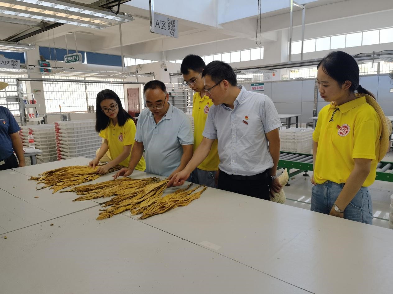 在大田乡烟草交易中心,党员们与当地烟草种植户积极探讨晾制过程中温度、湿度控制的问题,并了解到气候、土壤、农田害虫等因素降低烟草的质量和产量,从而降低了农产品的利润率。