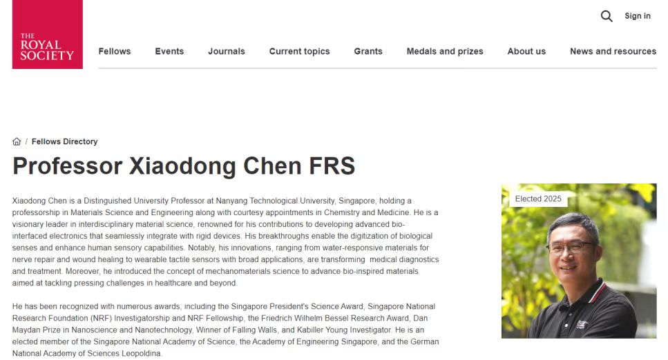 面对荣誉,陈晓东教授说:“我为被选为英国皇家学会院士感到自豪和荣幸。这个荣誉不仅仅是我的,它属于我的研究团队、南洋理工大学和新加坡。这种认可激励我不断探索新的想法,并将发现转化为现实世界中的有影响力的解决方案,造福人类。”