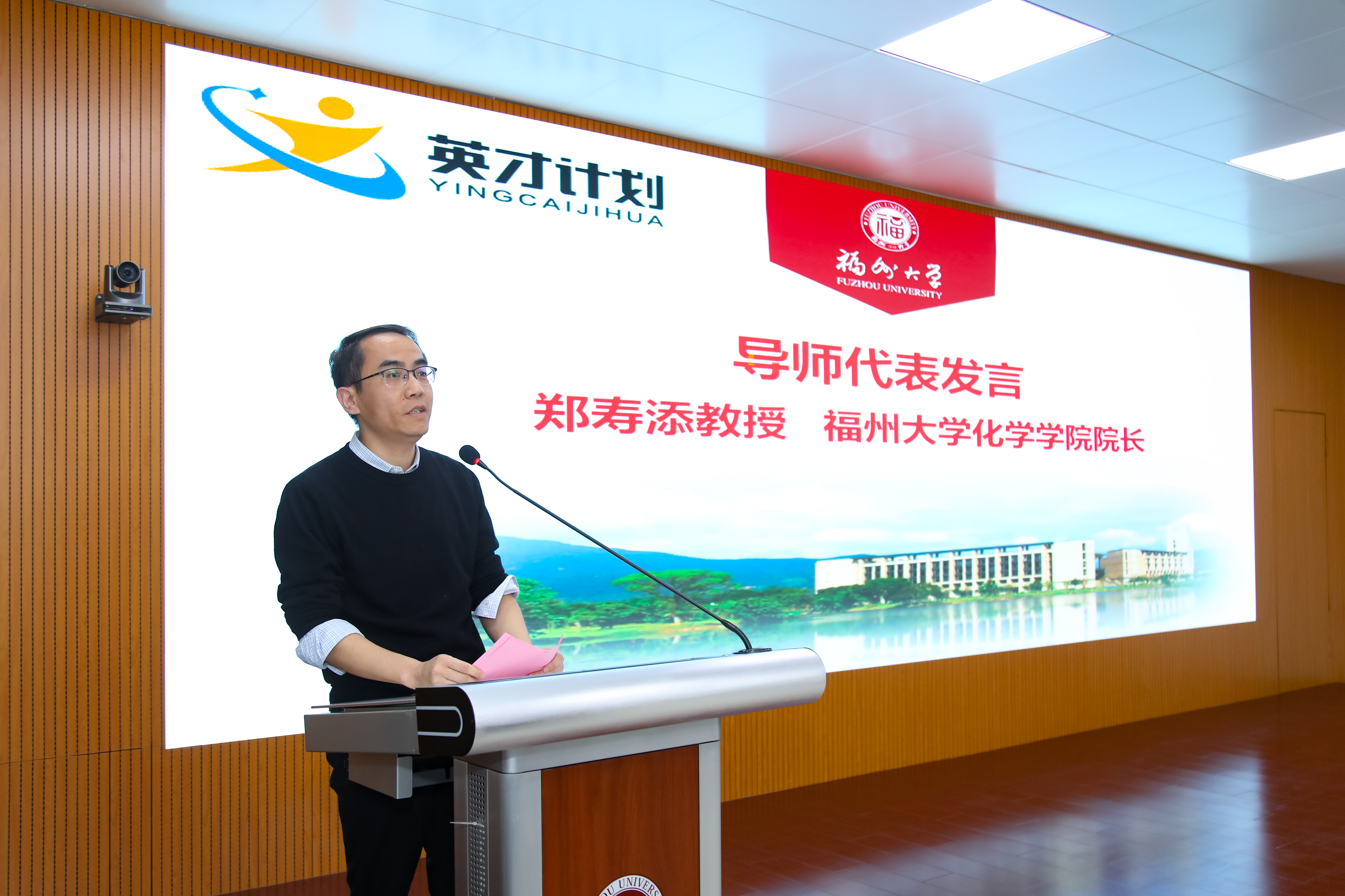 优秀的师资队伍和优质的实验室配套资源,希望同学们充分利用高校资源,探索未知、开拓创新,提升能力。郑寿添代表导师发言,表示将努力帮助学生拓展化学视野、积累科研知识、锻炼实践能力,希望同学们勤学习、善思考、多探究,在英才计划中学有所得、学有所获。