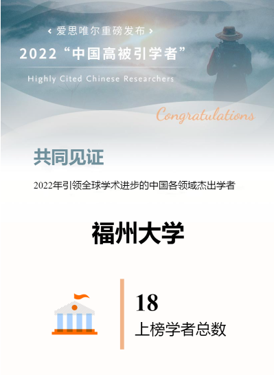 18位学者入选爱思唯尔2022年中国高被引学者榜单,其中来自化院的学者有10位。
