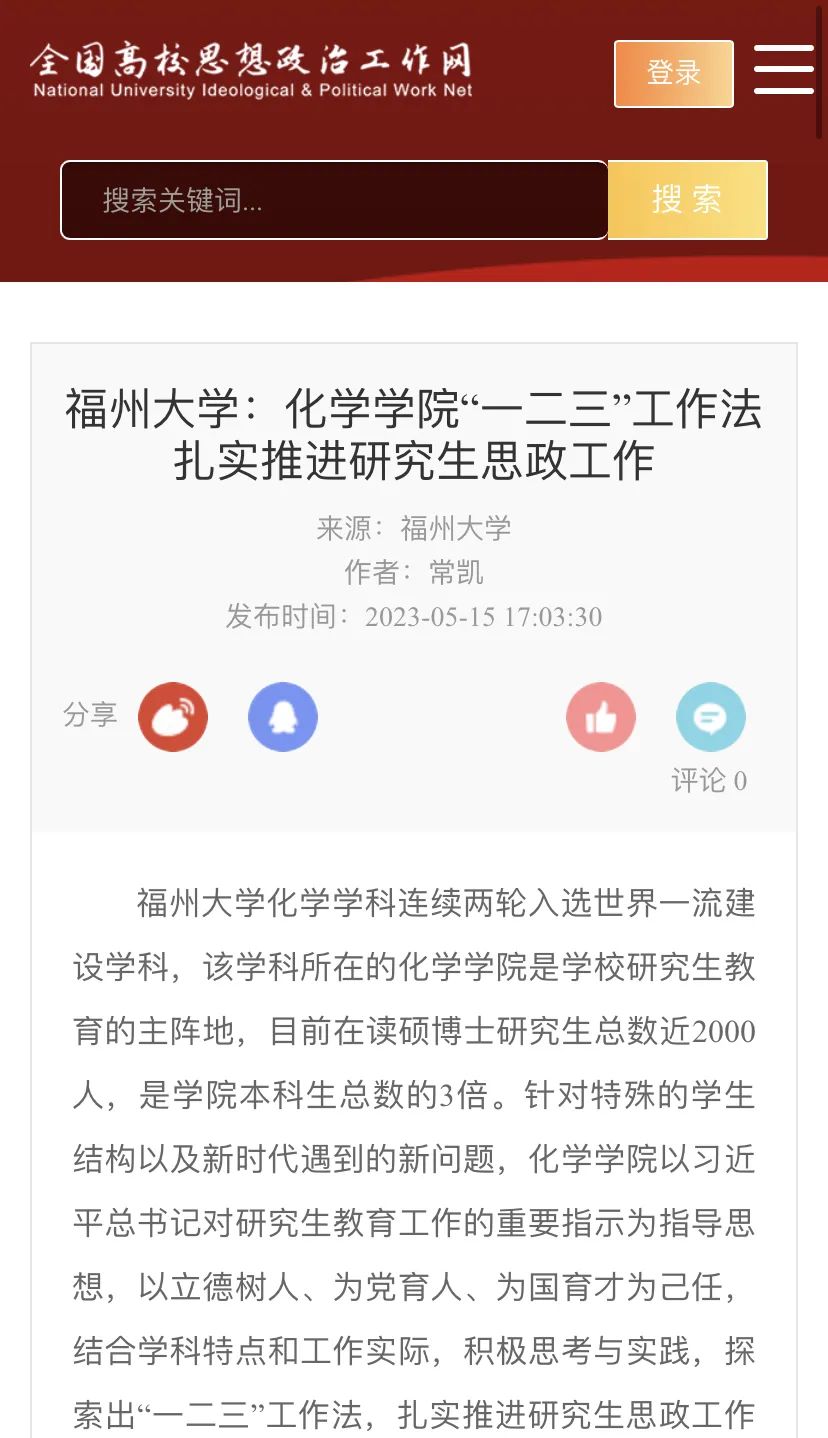 建好思想理论学习和实践基地,发挥学院团委、研究生会等研究生党团组织的引领作用,号召广大研究生自觉、主动学习习近平新时代中国特色社会主义思想。站好网络思政高地,建立健全网络思政工作体系,充分发挥好官网、官微的思政教育功能,讲好化院故事、发出一流强音。学院官微2022年共推送文章218篇,获校外主流媒体报道18篇,学校媒体报道45篇,获评色色动漫