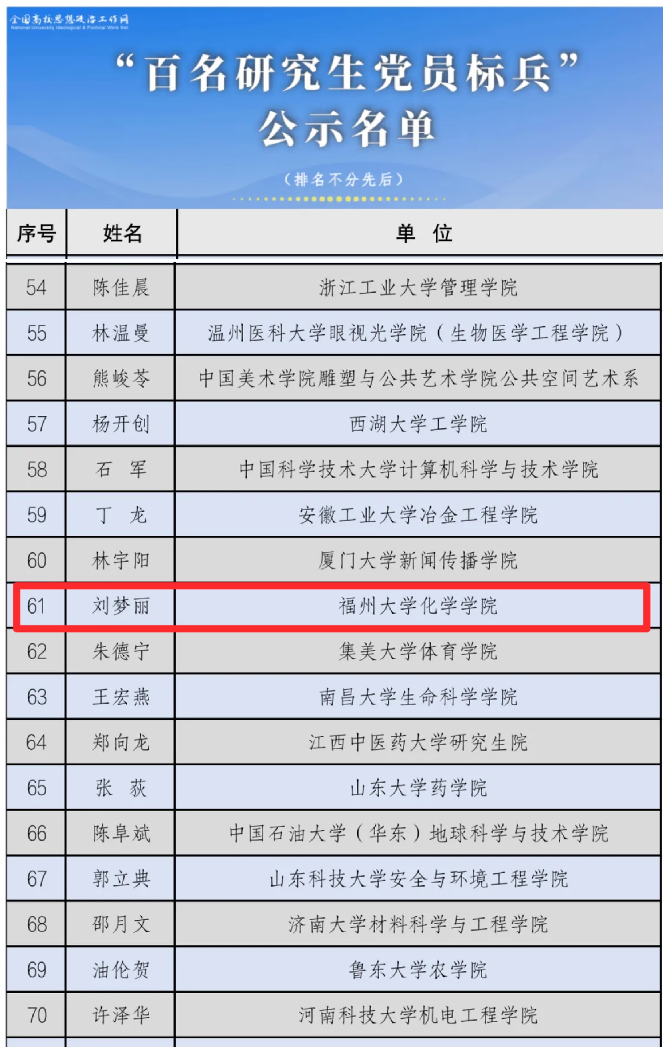 第三批全国高校“百名研究生党员标兵”公示名单