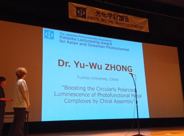 “分子工程+”研究院钟羽武教授荣获日本光化学协会(Japanese Photochemistry Association, JPA)设立的“亚洲及太平洋地区Kataoka光化学家讲座奖”。作为本年度唯一获奖者,钟羽武教授在会议上作了获奖报告,并接受日本光化学协会主席Masako Kato教授为其颁发的获奖证书,表彰其在“手性组装增强光功能金属配合物圆偏振发光”方面所做的开创性工作。