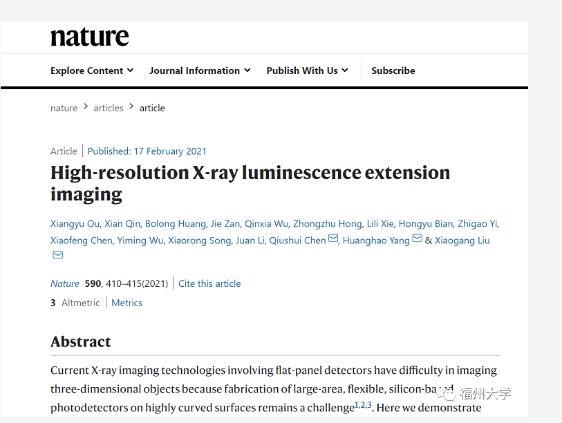 杨黄浩教授、陈秋水教授课题组的合作研究论文“High-resolution X-ray luminescence extension imaging” (Nature, 2021, 590, 410-415),《Nature》杂志同期发表述评指出此项研究极大地推动了X射线成像技术发展(News & Views),标志着我国在柔性X射线成像技术方面进入国际先进行列,并有望突破国外的技术限制,推进高端X射线影像装备的国产化。这是继杨黄浩教授研究团队在2018年实现色色动漫