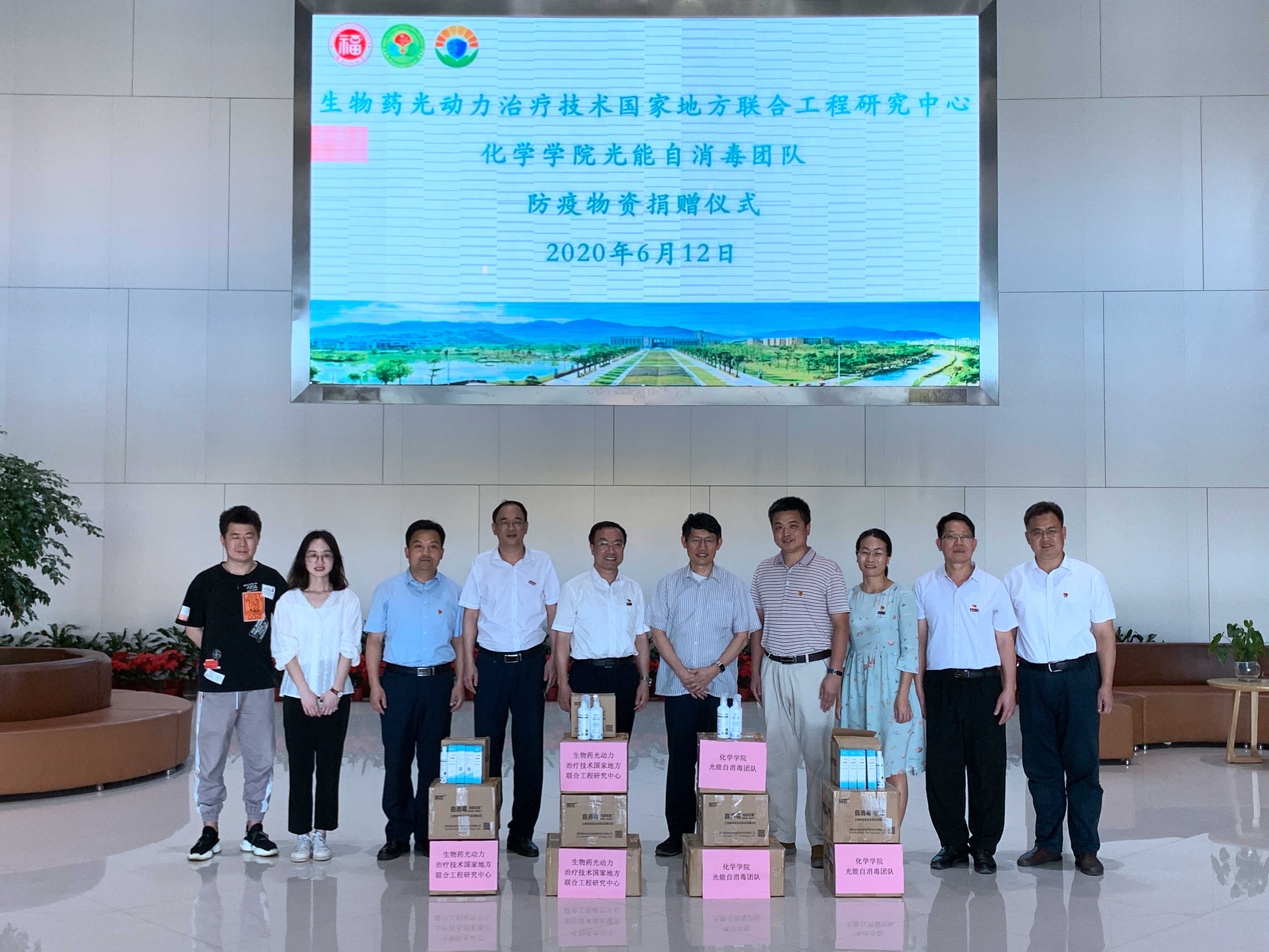 林键副校长代表学校表达感谢,并指出捐赠防疫物资彰显了科学工作者的社会责任与担当,学校将统一调配使用捐赠物资,确保疫情防控工作有序推进。他表示,此次生物药光动力治疗技术国家地方联合工程研究中心与青岛阳光动力生物医药技术有限公司合作研发的新技术卫生产品,充分体现了高等院校通过高新技术转移、产学研合作在社会服务领域所能做出的努力和贡献,希望师生继续创新突破、不断尝试,努力将科研成果进行落地转化,真正与企业、研究机构等实现产学研一体的良性互动,共同为高校社会服务、国家技术进步贡献更大的力量。