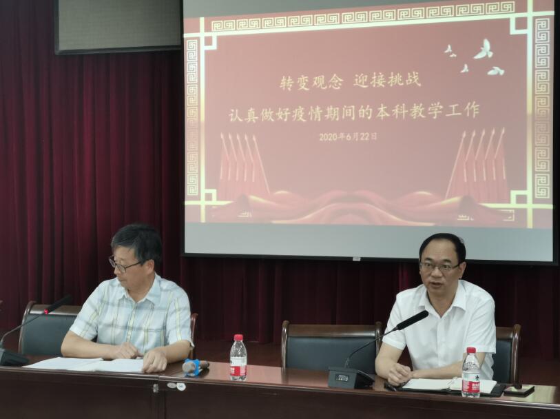 接下来袁耀锋副院长总结本学期我院线上教学工作、今年我院毕业班考研升学及毕业的情况等,并传达了6月16日由黄志刚副校长主持的校本科教育教学工作会议精神,指出老师们应尽快适应疫情形势的新挑战,转变观念,未来线上教学及线上考试将成为常态。