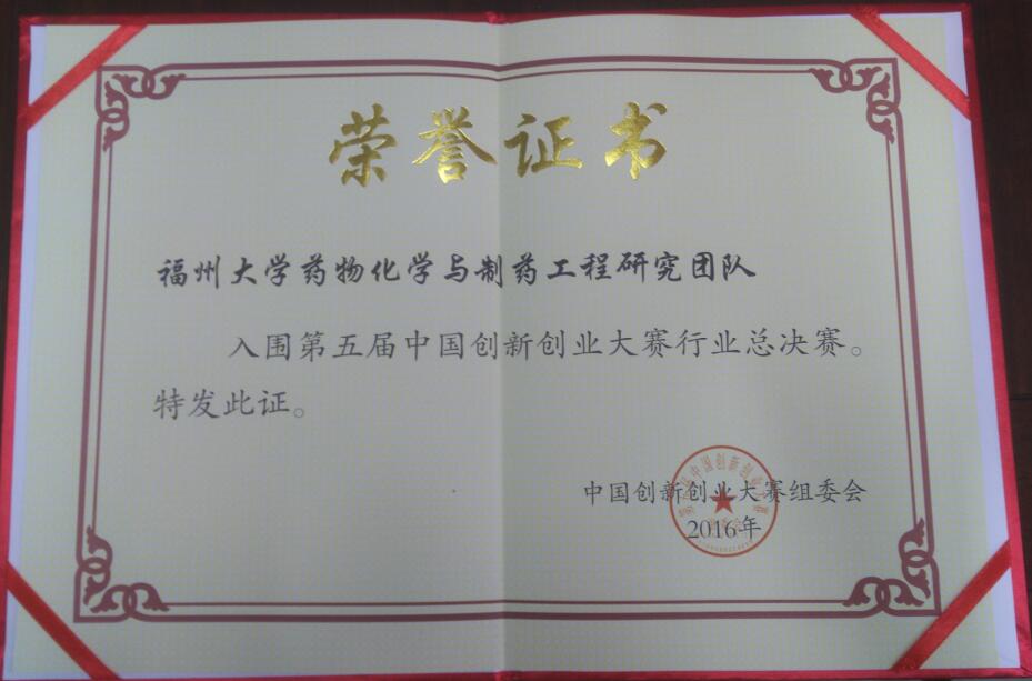 药物化学与制药工程研究团队以小组第二名的成绩获得全国第五届中国创新创业大赛优秀团队奖。