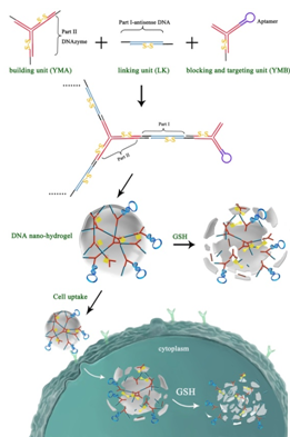 杨黄浩教授课题组与美国佛罗里达大学谭蔚泓教授课题组合作,成功制备了刺激响应的DNA纳米水凝胶,实现肿瘤靶向性的活细胞荧光成像和基因治疗。通过设计了2种Y型单体:1种是组装单体AY,含有3个粘性末端;1种为阻止单体BY,仅含有一个粘性末端,同时含有癌细胞靶向的核酸适体。另应用具有和Y单体粘性末端互补的双链DNA作为交联剂LK,通过DNA组装,可形成纳米结构的水凝胶。更有趣的是,通过改变两种单体的比例能够形成不同大小的DNA水凝胶颗粒,颗粒大约为75 nm-240 nm。为实现基因治疗,在AY单体中设计含有DNAzyme基因,能够识别切割特异的mRNA;在交连DNA(LK)中设计含有反义基因;在非治疗基因序列中设计含有双硫键。而且,水凝胶纳米颗粒中含有核酸适体,具有很好的靶向性。因此,进入靶细胞后,该纳米水凝胶在细胞内GSH的作用下发生解体,释放治疗基因,达到基因治疗的目的。该工作以“Self-assembly of DNA Nanohydrogels with Controllable Size and Stimuli-Responsive Property for Targeted Gene Regulation Therapy”为题发表于J. Am. Chem. Soc., 2015, 137, 1412-1415.