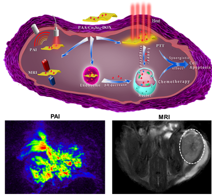 近年来发展起来的诊疗一体化纳米探针不仅可以实现肿瘤的成像和治疗,而且可以实时跟踪治疗效果。近日,杨黄浩教授课题组与厦门大学刘刚教授课题组合作,成功制备了硒化钴纳米盘材料。该硒化钴纳米盘的生物毒性低,且具有近红外光吸收和缩短核磁共振横向弛豫时间的性能。通过细胞和小鼠实验证明了该纳米材料可以用做肿瘤的光声和核磁共振双模态成像造影剂,并且也可用做光热治疗试剂,在近红外光照射下实现对肿瘤的光热杀伤。同时,由于硒化钴纳米盘的高比表面积,也可以吸附抗癌药物形成药物纳米材料复合物,该复合物显示了对肿瘤酸性环境响应的药物释放性能。通过多模态成像定位后,对小鼠局部位置进行光照,可实现肿瘤的光热和化学联合治疗以达到最佳治疗效果。该新型诊疗纳米试剂的制备方法简单,不仅可以大大提高肿瘤的治疗效果又降低了副作用。该工作也将拓宽二维纳米材料的生物医学应用。该工作以“Co9Se8 Nanoplates as a New Theranostic Platform for Photoacoustic/Magnetic Resonance Dual-Modal Imaging Guided Chemo-Photothermal Combination Therapy”为题发表于Adv. Mater. //onlinelibrary.wiley.com/doi/10.1002/adma.201405634/full。